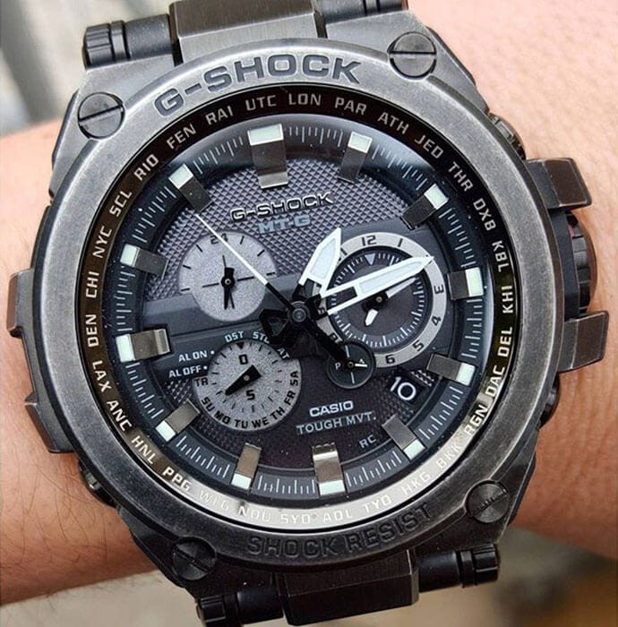 Поверхность часов специально состарена, создавая эффект ретро-стиля, привлекательно смотрится тёмно-фиолетовая расцветка. Внушительный корпус, крупные детали, брутальный дизайн, оригинальное расположение миниатюрных циферблатов – черты, присущие представителям коллекции G-shock. Для изготовления ударопрочного корпусаУдаропрочный корпусМеханизм заключён в корпус, выполненный из современных материалов, устойчивых к ударам, механическим повреждениям и падению с высоты: инновационный пластик, карбон, нержавеющая сталь, титан. использовали долговечную нержавеющую сталь 316L в сочетании с полимером и слоем геля Alpha Gel®, противостоящим воздействию вибрации и перегрузок. Абсолютная точность времени устанавливается автоматической синхронизацией по радиосигналу с 6 вышек. Люминесцентная подсветкаЛюминесцентное покрытиеПозволяет считывать показания времени в темноте. Производители наносят на стрелки, часовые индексы, безель или поверхность циферблата светонакопительный состав, дающий холодное свечение.. Питание от солнечной батареи . Сапфировое стекло с покрытием «антиблик». Функциональные особенности: секундомер, будильник, таймер, мировое времяМировое время Полезное часовое усложнение, отображающее время в основных городах и известных областях по всему миру, оно связано с часовыми поясами, удобно для путешественников и бизнесменов. . Износоустойчивое IP-покрытиеIP-покрытиеМетод ионного напыления. Демонстрирует повышенную устойчивость к истиранию, окислению и химическим веществам. Под воздействием высокого давления и температуры около 1500°C молекулы металла надёжно соединяются с частицами корпуса часов.. Габариты: 58,6 x 53,5 x 15,5 мм.