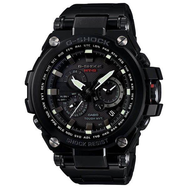 Внушительный корпус с красными цветовыми акцентами, крупные детали, брутальный дизайн, оригинальное расположение миниатюрных циферблатов – черты, присущие представителям коллекции G-shock. Для изготовления чёрного ударопрочного корпусаУдаропрочный корпусМеханизм заключён в корпус, выполненный из современных материалов, устойчивых к ударам, механическим повреждениям и падению с высоты: инновационный пластик, карбон, нержавеющая сталь, титан. использовали долговечную нержавеющую сталь 316L в сочетании с полимером и слоем геля Alpha Gel®, противостоящим воздействию вибрации и перегрузок. Абсолютная точность времени устанавливается автоматической синхронизацией по радиосигналу с 6 вышек. Люминесцентная подсветкаЛюминесцентное покрытиеПозволяет считывать показания времени в темноте. Производители наносят на стрелки, часовые индексы, безель или поверхность циферблата светонакопительный состав, дающий холодное свечение.. Питание от солнечной батареи . Сапфировое стекло с покрытием «антиблик». Функциональные особенности: секундомер, будильник, таймер, мировое времяМировое время Полезное часовое усложнение, отображающее время в основных городах и известных областях по всему миру, оно связано с часовыми поясами, удобно для путешественников и бизнесменов. . Износоустойчивое IP-покрытиеIP-покрытиеМетод ионного напыления. Демонстрирует повышенную устойчивость к истиранию, окислению и химическим веществам. Под воздействием высокого давления и температуры около 1500°C молекулы металла надёжно соединяются с частицами корпуса часов.. Габариты: 58,6 x 53,5 x 15,5 мм.