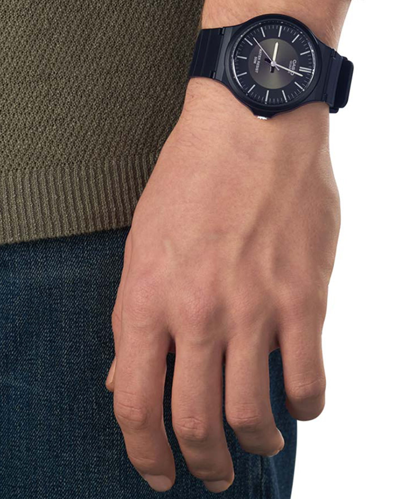 Японские мужские часы в спортивном стиле Casio Collection MW-240-1E3, кварцевый механизм с высокой точностью. Класс водозащиты: 50 метров, позволит защитить корпус от случайных брызг или капель дождя. Корпус часов изготовлен из пластика, черного цвета.