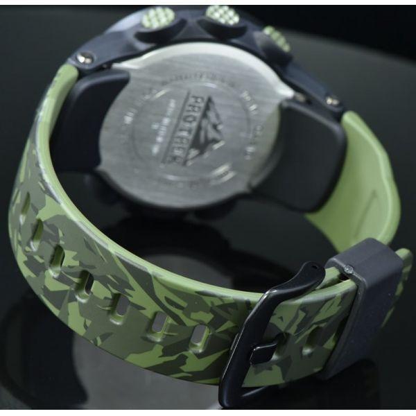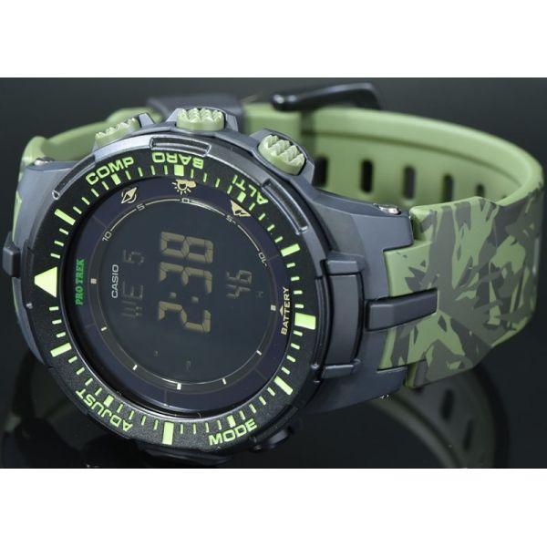 Часы, созданные для любителей активного отдыха. Противоударные мужские часы, выполненные в стиле миллитари. Кварцевые часы круглой формы с темно-зеленым цветом фона. Пластиковый корпус с минеральным стеклом удерживается пластиковым браслетом. Часы Casio PRG-300CM-3E оснащены секундомером, таймером обратного отсчета, барометром, высотомером, компасом. Источником энергии является солнечная батарея.