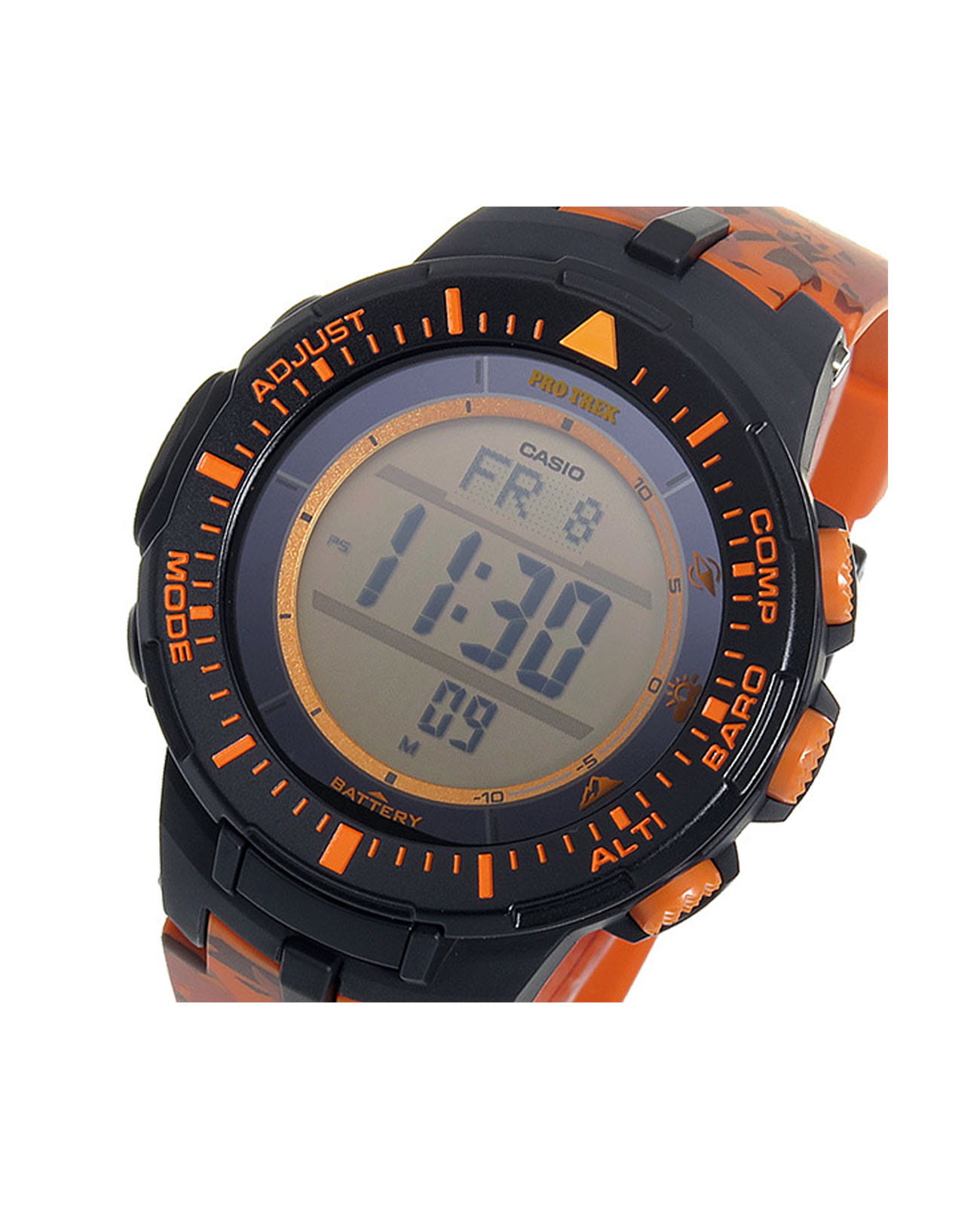 Японские мужские часы-хронографХронографФункция позволяет измерять отрезки времени с особой точностью: часы, минуты, секунды. Верным признаком хронографа является наличие на циферблате 3 дополнительных окошек-счётчиков. Casio Pro Trek PRG-300CM-4DR из коллекции G-Shock. Минеральное стеклоМинеральное стеклоМинеральное стекло представляет собой искусственно выращенный минерал кварца. Такое стекло отличается особой устойчивостью к повреждениям и царапинам. Уступает по некоторым качествам сапфировому стеклу. устойчивое к появлению царапин, обладающее высокой прозрачностью. Pro Trek представляет новые камуфляжные вариации для многофункциональных и спортивных часов. Triple Sensor - General-Purpose Line. Питание от солнечной энергии Tough SolarTough SolarТехнология основана на подзарядке аккумулятора от источника солнечного света, специальная панель улавливает солнечные лучи и преобразует их в энергию для работы часов. Достаточно пары минут нахождения на солнце для функционирования часов в течении суток. - солнечные батарейки большой мощности, индикатор заряда батареи. Функция автоматического сохранения энергии. Время работы аккумулятора без подзарядки приблизительно 8 месяцев, при включенной функции сохранения энергии приблизительно 23 месяца. Модуль часов рассчитан на работу при низких температурах до -10°С/14°F. Циферблат подсвечивается ярким светодиодомСветодиодная подсветкаСветодиодная или LED-подсветка обеспечивает появление яркого холодного свечения за счёт LED-элементов - маленьких лампочек. Они потребляют минимальное количество энергии, чаще всего можно встретить 1 светодиод, в нижней части циферблата., при недостаточном освещении во время поворота запястья в сторону лица подсветка включается автоматически. Мировое времяМировое время Полезное часовое усложнение, отображающее время в основных городах и известных областях по всему миру, оно связано с часовыми поясами, удобно для путешественников и бизнесменов. – 48 городов (29 часовых поясов), всемирное координированное время (UTC). Функция включения/отключения летнего времени. 12-ти и 24-х часовой формат времени. Время восхода и захода Солнца. Технология Triple Sensor позволяет точно и легко определять сторону света, температуру и атмосферное давление. Термометр от -10° до +60°С с точностью 0,1°C. Барометр - измерение атмосферного давления от 260 до 1100 гПа (от 195 до 825 мм рт. ст.). Встроенный цифровой компас. Диапазон измерения от 0° до 359° с точностью 1°. Высотомер - встроенный датчик барометрического давления с возможностью вывода результатов в единицах высоты над уровнем моря (от -700 до 10000 метров). СекундомерСекундомерСекундоме́р — прибор, способный измерять интервалы времени с точностью до долей секунды. с точностью измерения 1/100 секунды и измерением до 23 часов 59 минут 59,99 cек. ТаймерТаймерОтсчитывает секунды в обратном направлении в заданном интервале времени. обратного отсчета (диапазон времени 24 часа), автоматический календарь, 12/24 отображение времени. 5 будильниковБудильникБуди́льник — часы, в заданный момент времени подающие звуковой, световой и/или в редких случаях другой сигнал., один с функцией Snooze, ежечасный сигнал. Класс водозащиты: 100 метров, позволит плавать, нырять и заниматься другими водными видами спорта. Ремешок из полимерного материала на стандартной застежке.