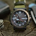 Полимерный ударопрочный корпусУдаропрочный корпусМеханизм заключён в корпус, выполненный из современных материалов, устойчивых к ударам, механическим повреждениям и падению с высоты: инновационный пластик, карбон, нержавеющая сталь, титан. защищает от ударов и повреждений, безельБезельВнешний ободок, закрепляющий стекло. В спортивных часах так называется поворотное кольцо с делениями на циферблате, выполняет роль таймера – замеряет отрезки времени на шкале. Неподвижный безель – элемент декора. Однонаправленно вращающийся безель на дайверских часах позволяет фиксировать моменты погружения и выныривания на поверхность. выполнен из нержавеющей стали 316L с IP-покрытиемIP-покрытиеМетод ионного напыления. Демонстрирует повышенную устойчивость к истиранию, окислению и химическим веществам. Под воздействием высокого давления и температуры около 1500°C молекулы металла надёжно соединяются с частицами корпуса часов.. Модель имеет расширенный список функциональных возможностей, способных быстро разрешить ту или иную ситуацию. Это барометр, термометр -10°C /+60°C, высотомер с памятью данных, мировое времяМировое время Полезное часовое усложнение, отображающее время в основных городах и известных областях по всему миру, оно связано с часовыми поясами, удобно для путешественников и бизнесменов. – 29 городов, компас, таймер, секундомер, будильник, хронографХронографФункция позволяет измерять отрезки времени с особой точностью: часы, минуты, секунды. Верным признаком хронографа является наличие на циферблате 3 дополнительных окошек-счётчиков.. Осуществляется питание от источников света , индикатор уровня заряда батарейки покажет, когда часы нужно ставить на подзарядку. Японский кварцевый механизм. Минеральное стекло. Циферблат со светодиодной подсветкойСветодиодная подсветкаСветодиодная или LED-подсветка обеспечивает появление яркого холодного свечения за счёт LED-элементов - маленьких лампочек. Они потребляют минимальное количество энергии, чаще всего можно встретить 1 светодиод, в нижней части циферблата.. Люминесцентное покрытие NeobriteПодсветка NeobriteИспользование светонакопительных составов на основе сульфида цинка или алюмината стронция, яркий свет можно наблюдать на протяжении 6-10 часов после «зарядки» часов около источника света. для стрелок. Степень водостойкости WR 100. Тканевый ремешок цвета хаки. Корректировка времени по радиосигналу, UTCUTCВсемирное кординационное время, не имеющее привязки к географическому положению Гринвича, основывается на атомном отсчёте времени. Регулировка времени осуществляется более точно, чем устаревшее GMT.