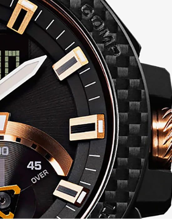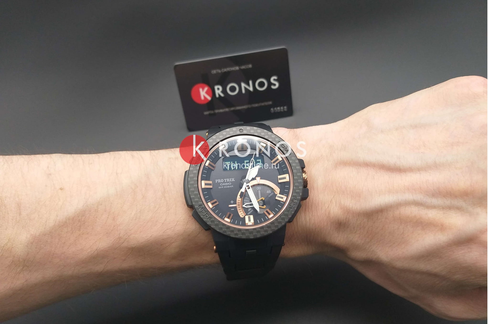 Перед вами лимитированная модель PRO TREK из серии PRW-7000 в черном корпусе с деталями цвета розового золота и карбоновым безелем вокруг аналого-цифрового циферблата Модель на композитном браслете визуально выглядит массивно но на деле очень легкая и это действительно фантастика, лимитированная модель выпущена ограниченным тиражом в 1300 экземпляров на весь мир, в Россию поступили несколько экземпляров