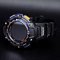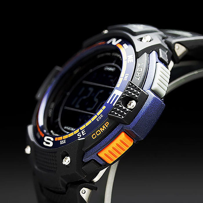 Корпус и браслет многофункциональных и стильных часов от Casio выполнены из высокопрочных полимерных материалов. Есть функции для определения погоды. Часы способны выдержать температуру даже ниже, чем -10 °C. Секундомер измеряет прошедшее время с точностью в 1/100 секунды. Быть максимально пунктуальными помогут 5 независимых будильников. Встроен цифровой компас. Электролюминесцентная подсветкаЭлектролюминесцентная подсветкаЭлектролюминесцентная панель устанавливается под ЖК-экраном часов, при нажатии кнопки электричество преобразуется в свет за счёт подачи напряжения на атомы фосфора, такой тип подсветки позволяет освещать весь циферблат. обеспечивает видимость информации в темноте. Высокая водонепроницаемость в 200 WR.