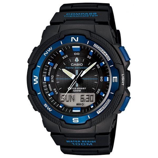 Многофункциональные часы круглой формы с аналогово-цифровым циферблатом черного цвета, обрамленным алюминиевым безелем цвета ночного неба. Черно-синий пластиковый корпус удерживается на руке черным пластиковым браслетом. Часы Casio SGW-500H-2B имеют светодиодную подсветку, встроенный цифровой компас, отображение возраста и фазы Луны, времени восхода и захода солнца, температурным датчиком, 5 будильниками и автоматическим календарем, указывающим число, день недели, месяц и год. Корпус - Алюминий; Стекло - Пластик; Водозащита - 100 м. (WR 100); Материал ремешка - Пластиковый; Цвет ремешка - Черный; Цвет циферблата - Черный.