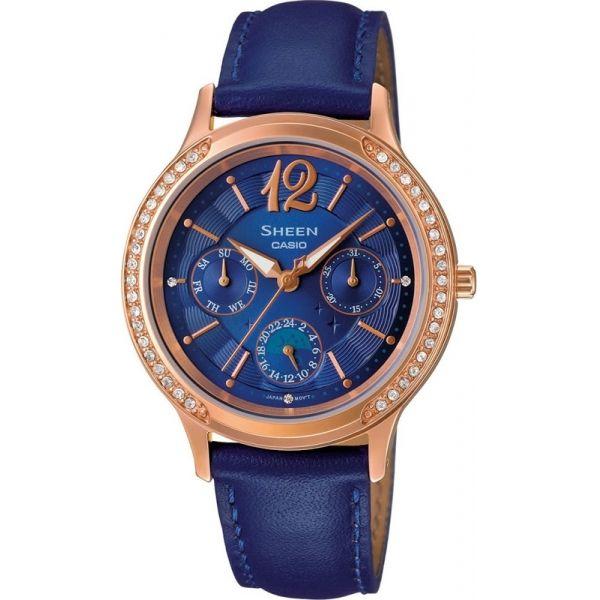 Имиджевые женские наручные часы, выполненные в fashion стиле. Кварцевые часы с элементом питания SR920SW. Корпус часов SHE-3030GL-2A выполнен из высокопрочной стали с полным IP покрытием. Синий фон циферблата перекликается с ярко-синим цветом ремешка из натуральной кожи. Водонепроницаемость часов 50 метров, минеральное стекло.  Украшены часы вставками из кристаллов Swarovski. Эти часы привлекут всеобщее внимание.