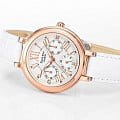 Стильные женские наручные часы, выполненные в fashion стиле. Кварцевые часы с элементом питания SR920SW. Корпус часов выполнен из высокопрочной стали с полным IP покрытием золотого цвета. Золотые индексы и стрелки на светлом циферблате. Водонепроницаемость часов 50 метров, минеральное стекло, устойчивое к царапинам. Украшены часы кристаллами Swarovski. Ремешок из натуральной кожи белого цвета прочно удерживает часы на руке.