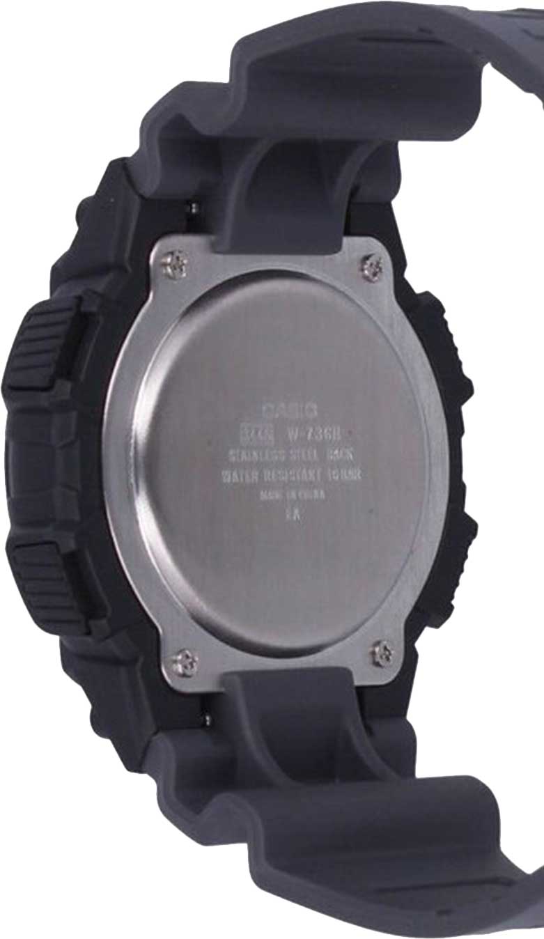 Кварцевые мужские часы Casio Collection W-736H-1A, оснащенные: отображением времени в двух часовых поясах, таймером. БудильникомБудильникБуди́льник — часы, в заданный момент времени подающие звуковой, световой и/или в редких случаях другой сигнал.. Циферблат подсвечивается ярким светодиодом. Послесвечение. Световая и вибрационная индикация сигнала. Цвет подсветки: белый. 12-ти и 24-х часовой формат времени. СекундомерСекундомерСекундоме́р — прибор, способный измерять интервалы времени с точностью до долей секунды. с точностью показаний 1/100с и временем измерения 24ч. Сплит-хронографСплит-хронографИспользуется для измерения продолжительности нескольких временных отрезков, начинающихся одновременно, а заканчивающихся в разное время.. Таймер обратного отсчета от 1с до 24ч. Функция включения/отключения звука. Батарея рассчитана на 10 лет