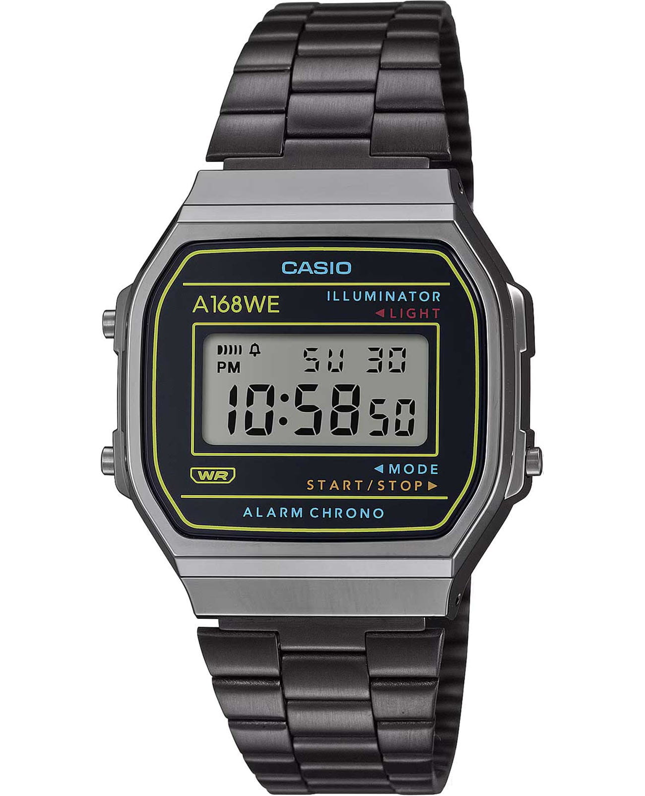 Casio A168WEHB-1A — это наручные часы в винтажном стиле, вдохновлённые дизайном карманного калькулятора SL-800 1983 года. Они сочетают ретро-эстетику с современными функциями. Размер корпуса: 38,6 × 36,3 × 9,6 мм Вес: 49 г Материал корпуса и безеля: с хромированным покрытием Браслет: нержавеющая сталь с регулируемой застёжкой Водонепроницаемость: WR 30 защита от брызг Питание: батарея CR2016 с ресурсом около 7 лет Стекло: пластиковое Подсветка: электролюминесцентнаяЭлектролюминесцентная подсветкаЭлектролюминесцентная панель устанавливается под ЖК-экраном часов, при нажатии кнопки электричество преобразуется в свет за счёт подачи напряжения на атомы фосфора, такой тип подсветки позволяет освещать весь циферблат. с синим цветом Функции: ежедневный будильник, почасовой сигнал, автоматический календарь, 12/24-часовой формат времени, секундомер с точностью 1/100 секунды и максимальным временем измерения 59'59.99" Эта модель идеально подойдёт для ценителей ретро-дизайна и функциональных аксессуаров.