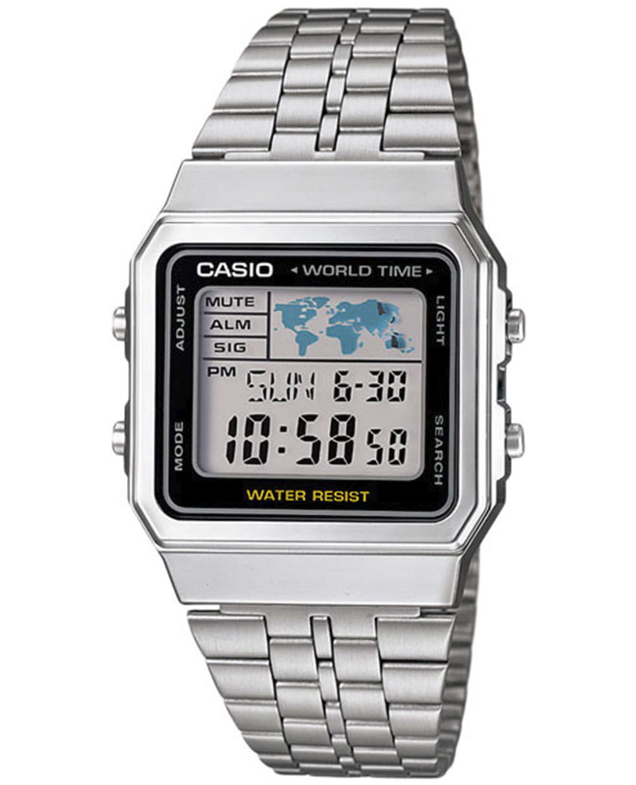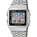 Японские мужские часы с хронографом Casio Vintage A500WA-1, кварцевый механизм с высокой точностью. Класс водозащиты: 30 метров, позволит защитить корпус от случайных брызг или капель дождя. Корпус часов изготовлен из пластика, серебристого цвета. Светодиодная подсветкаСветодиодная подсветкаСветодиодная или LED-подсветка обеспечивает появление яркого холодного свечения за счёт LED-элементов - маленьких лампочек. Они потребляют минимальное количество энергии, чаще всего можно встретить 1 светодиод, в нижней части циферблата. с настраиваемым временем свечения 1,5 или 3 сек. Индикация времени в 4 часовых поясах с отображением на схематической карте мира. Отображение мирового времени Мировое время Полезное часовое усложнение, отображающее время в основных городах и известных областях по всему миру, оно связано с часовыми поясами, удобно для путешественников и бизнесменов. в 31 часовом поясе с отображением 48 основных городов в этих зонах. СекундомерСекундомерСекундоме́р — прибор, способный измерять интервалы времени с точностью до долей секунды. с точностью измерений 1/100 сек., общее время измерений 24 часа. Таймер обратного отсчета на 24 часа. 5 ежедневных будильников и ежечасный сигнал. Автоматический календарь учитывает количество дней в месяцах, включая 28 в феврале. Отображение даты и дня недели и месяца. Формат времени 12/24-часовой. Дизайн корпуса соответствует современному универсальному стилю и имеет в оформлении элементы, напоминающие о первых электронных часах. Корпус из твердого и долговечного пластика.