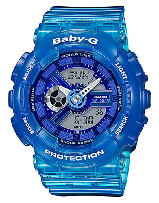 Противоударные японские женские часы Casio Baby-G BA-110JM-2A, кварцевый механизм с высокой точностью. Класс водозащиты: 100 метров, позволит плавать, нырять и заниматься другими водными видами спорта. Корпус часов изготовлен из пластика, прозрачного цвета.