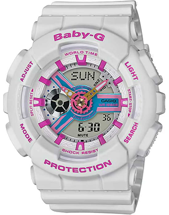 Современные надежные японские наручные женские часы Casio Baby-G BA-110NR-8A. Точность хода: не хуже +/-15 секунд в месяц. Светодиодная подсветкаСветодиодная подсветкаСветодиодная или LED-подсветка обеспечивает появление яркого холодного свечения за счёт LED-элементов - маленьких лампочек. Они потребляют минимальное количество энергии, чаще всего можно встретить 1 светодиод, в нижней части циферблата. с функцией автоматической подсветки при наклоне часов. Функция cекундомераСекундомерСекундоме́р — прибор, способный измерять интервалы времени с точностью до долей секунды.. Таймер обратного отсчета. 5 ежедневных будильников. Автоматический календарь. Функция мирового времени. Отображение времени в 12-часовом или 24-часовом формате. Особая ударопрочная конструкция защищает от ударов и вибрации. Минеральное стеклоМинеральное стеклоМинеральное стекло представляет собой искусственно выращенный минерал кварца. Такое стекло отличается особой устойчивостью к повреждениям и царапинам. Уступает по некоторым качествам сапфировому стеклу. устойчивое к появлению царапин, обладающее высокой прозрачностью. Ремешок из полимерного материала. Натуральный полимерный материал является идеальным для изготовления ремешка благодаря своей чрезвычайной прочности и гибкости. Корпус выполнен из высококачественного пластика. Задняя крышка стальная. Класс водозащиты: 100 метров, позволит плавать, нырять и заниматься другими водными видами спорта.