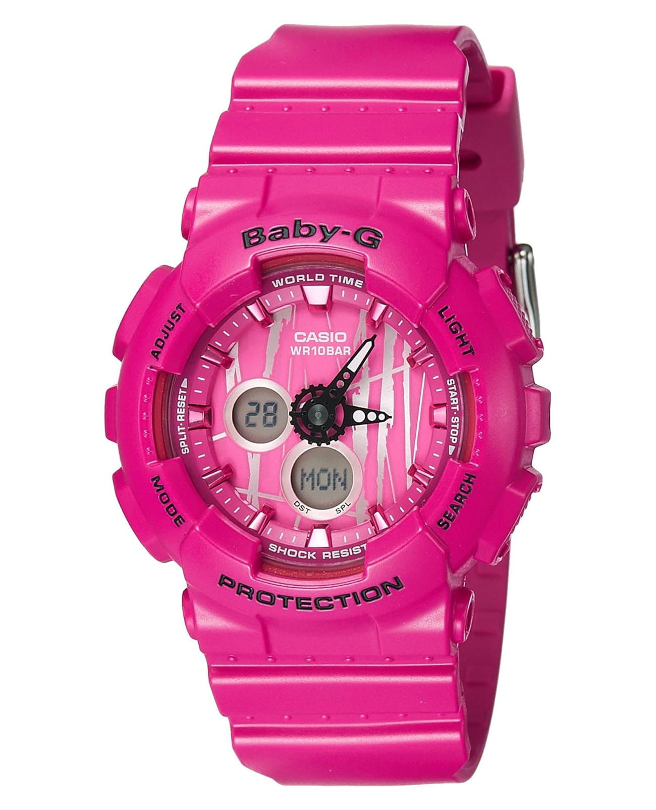 Японские женские часы-хронографХронографФункция позволяет измерять отрезки времени с особой точностью: часы, минуты, секунды. Верным признаком хронографа является наличие на циферблате 3 дополнительных окошек-счётчиков. Casio Baby-G BA-120SP-4ADR из коллекции Baby-G. Серия, которая выражает спортивность и цвет, которые являются основой бренда Baby-G. Минеральное стеклоМинеральное стеклоМинеральное стекло представляет собой искусственно выращенный минерал кварца. Такое стекло отличается особой устойчивостью к повреждениям и царапинам. Уступает по некоторым качествам сапфировому стеклу. устойчивое к появлению царапин, обладающее высокой прозрачностью. Корпус часов изготовлен из полимерного материала. Функции: автоматическая светодиодная подсветка.Необритовое покрытиеПодсветка NeobriteИспользование светонакопительных составов на основе сульфида цинка или алюмината стронция, яркий свет можно наблюдать на протяжении 6-10 часов после «зарядки» часов около источника света. продолжает светиться в темноте даже после непродолжительного пребывания на свету.Ударопрочный корпусУдаропрочный корпусМеханизм заключён в корпус, выполненный из современных материалов, устойчивых к ударам, механическим повреждениям и падению с высоты: инновационный пластик, карбон, нержавеющая сталь, титан. защищает механизм от ударов и вибрации. Функция Мирового времениМировое время Полезное часовое усложнение, отображающее время в основных городах и известных областях по всему миру, оно связано с часовыми поясами, удобно для путешественников и бизнесменов. . СекундомерСекундомерСекундоме́р — прибор, способный измерять интервалы времени с точностью до долей секунды. с точностью измерения 1/100 секунды и измерением до 23 часов 59 минут 59,99 cек. ТаймерТаймерОтсчитывает секунды в обратном направлении в заданном интервале времени. обратного отсчета (диапазон времени 24 часа), автоматический календарь, 12/24 отображение времени. 5 ежедневных будильниковБудильникБуди́льник — часы, в заданный момент времени подающие звуковой, световой и/или в редких случаях другой сигнал.. Класс водозащиты: 100 метров, позволит плавать без погружения. Ремешок из полимерного материала на стандартной застежке.
