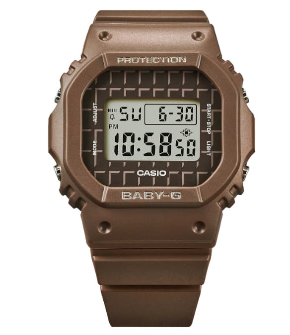 Женские противоударныеУдаропрочный корпусМеханизм заключён в корпус, выполненный из современных материалов, устойчивых к ударам, механическим повреждениям и падению с высоты: инновационный пластик, карбон, нержавеющая сталь, титан. японские часы Casio Baby-G BGD-565USW-5, кварцевый механизм с высокой точностью. Класс водозащиты: 100 метров, позволит плавать, нырять и заниматься другими водными видами спорта. С широким функционалом, в который входит: ХронографХронографФункция позволяет измерять отрезки времени с особой точностью: часы, минуты, секунды. Верным признаком хронографа является наличие на циферблате 3 дополнительных окошек-счётчиков., таймер, будильник, батарейка на 3 года, мировое время Мировое время Полезное часовое усложнение, отображающее время в основных городах и известных областях по всему миру, оно связано с часовыми поясами, удобно для путешественников и бизнесменов. , 12/24-часовое отображение времени, автоматический календарь. Электролюминесцентная подсветкаЭлектролюминесцентная подсветкаЭлектролюминесцентная панель устанавливается под ЖК-экраном часов, при нажатии кнопки электричество преобразуется в свет за счёт подачи напряжения на атомы фосфора, такой тип подсветки позволяет освещать весь циферблат. подсветка дисплея помогает считывать информацию при плохом освещении. Корпус часов изготовлен из пластика, шоколадного цвета.