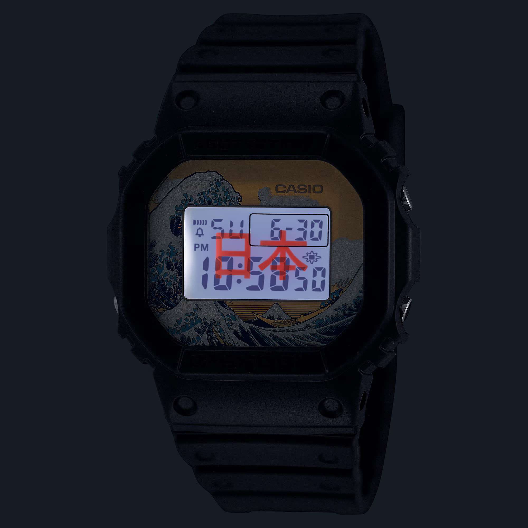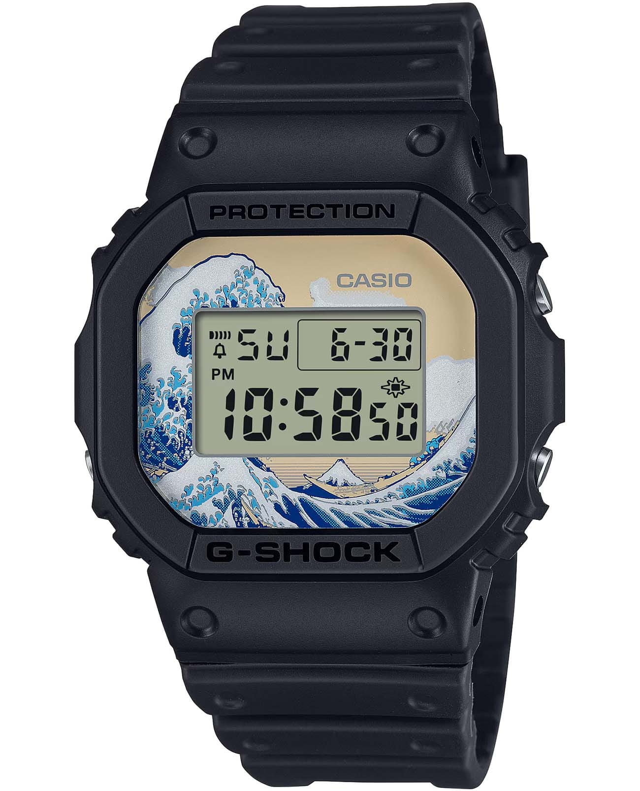Мужские японские ударопрочныеУдаропрочный корпусМеханизм заключён в корпус, выполненный из современных материалов, устойчивых к ударам, механическим повреждениям и падению с высоты: инновационный пластик, карбон, нержавеющая сталь, титан. часы Casio G-Shock DW-5600KHK25-1, механизм с высокой точностью. Это отсылка к знаменитой работе мастера «Великая волна» (The Great Wave), ее циферблат с динамичными синими и белыми оттенками символизирует морские волны и мощь природы. Минеральное стеклоМинеральное стеклоМинеральное стекло представляет собой искусственно выращенный минерал кварца. Такое стекло отличается особой устойчивостью к повреждениям и царапинам. Уступает по некоторым качествам сапфировому стеклу. защищает циферблат от царапин, а водозащита до 200 метров достаточна для плавания и активного отдыха. Корпус часов изготовлен из пластика и эффектно подчеркивает художественные элементы циферблата. Ударопрочный корпусУдаропрочный корпусМеханизм заключён в корпус, выполненный из современных материалов, устойчивых к ударам, механическим повреждениям и падению с высоты: инновационный пластик, карбон, нержавеющая сталь, титан. защищает механизм от ударов и вибрации. Светодиодная подсветкаСветодиодная подсветкаСветодиодная или LED-подсветка обеспечивает появление яркого холодного свечения за счёт LED-элементов - маленьких лампочек. Они потребляют минимальное количество энергии, чаще всего можно встретить 1 светодиод, в нижней части циферблата. дисплея. Функции данной модели включают в себя секундомерСекундомерСекундоме́р — прибор, способный измерять интервалы времени с точностью до долей секунды., автоматический календарь, таймерТаймерОтсчитывает секунды в обратном направлении в заданном интервале времени., будильникБудильникБуди́льник — часы, в заданный момент времени подающие звуковой, световой и/или в редких случаях другой сигнал.. Ремешок из полимерного материала с классической застежкой. Идеальный выбор для тех, кто ценит стиль, функциональность и качество.
