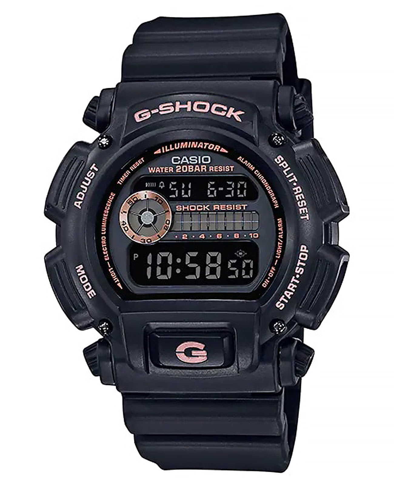 Многофункциональные, спортивные мужские часы Casio G-Shock DW-9052GBX-1A4DR (DW-9052GBX-1A4), электронный механизм с высокой точностью. Класс водозащиты: 200 метров, позволит плавать, нырять и заниматься другими водными видами спорта. Корпус часов изготовлен из пластика, черного цвета.