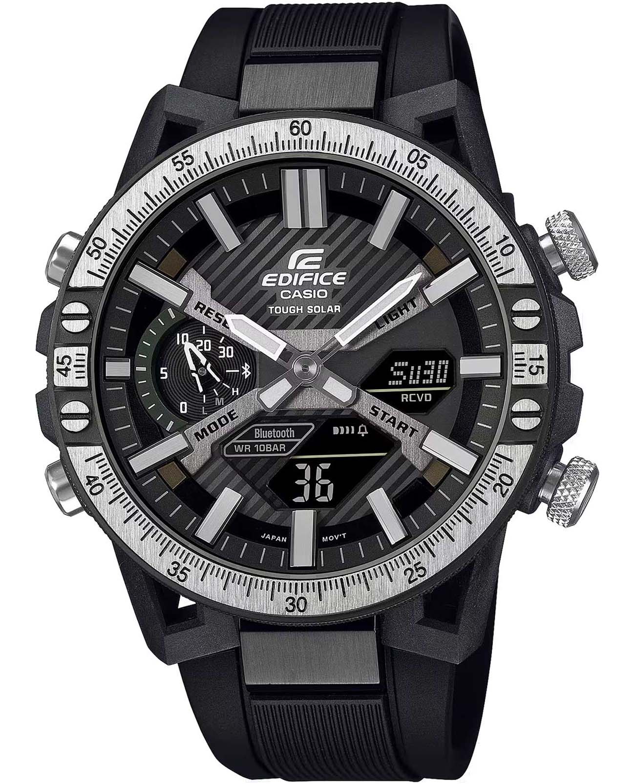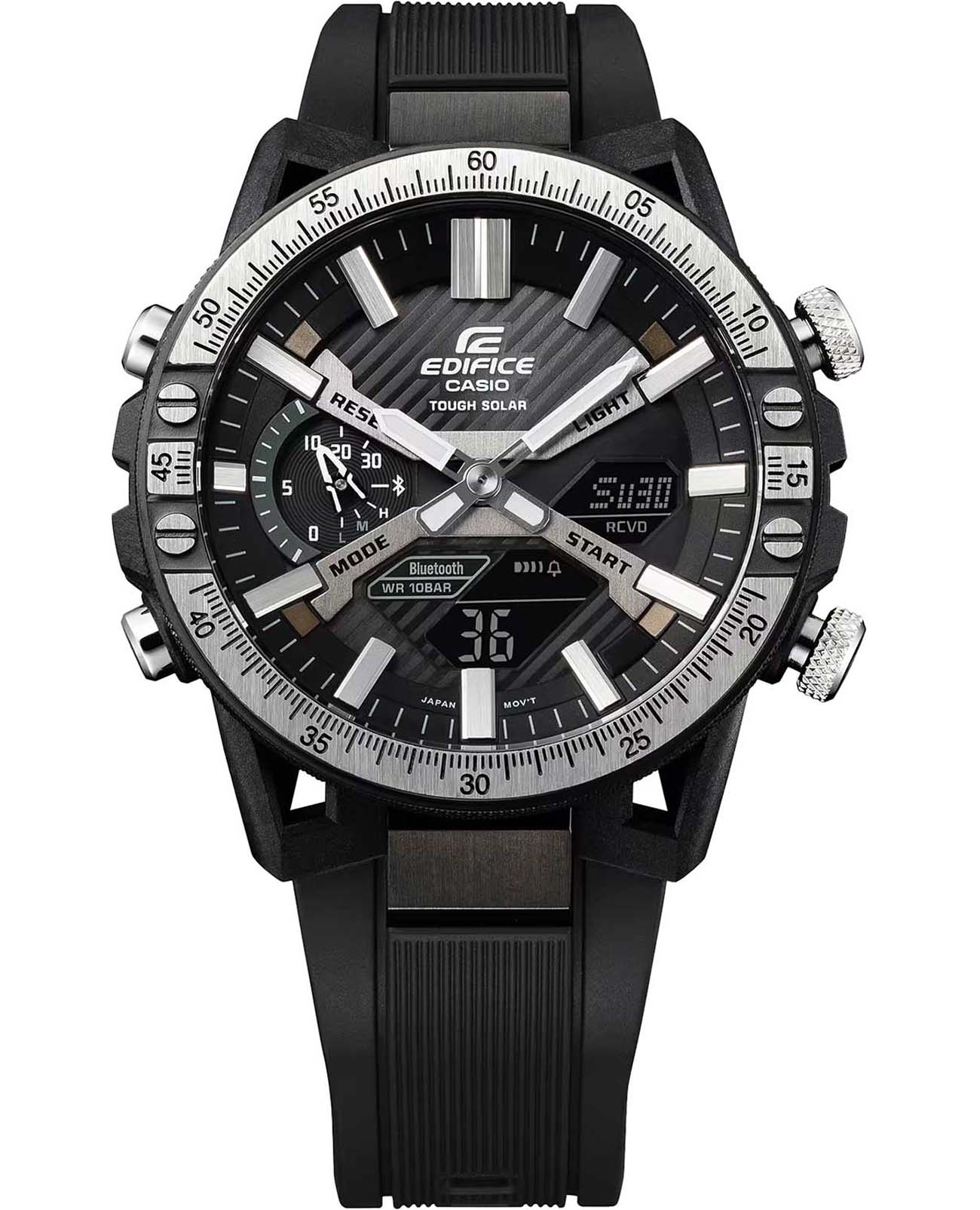 Многофункциональные японские мужские часы Casio Edifice ECB-2000TP-1A. Среди функций питание от солнечной энергии Tough SolarTough SolarТехнология основана на подзарядке аккумулятора от источника солнечного света, специальная панель улавливает солнечные лучи и преобразует их в энергию для работы часов. Достаточно пары минут нахождения на солнце для функционирования часов в течении суток., автоматическое сохранение энергии. Время работы аккумулятора без подзарядки приблизительно 7 месяцев, при включенной функции сохранения энергии приблизительно 18 месяцев. Двойная светодиодная подсветка Super Illuminator с функцией Afterglow. Цвет подсветки: белый. 12-ти и 24-х часовой формат времени. Секундомер с двумя точностями показаний: 1/100с (до 1ч) и 1с (после 1ч) и временем измерения 24ч. SPLIT-хронографСплит-хронографИспользуется для измерения продолжительности нескольких временных отрезков, начинающихся одновременно, а заканчивающихся в разное время.. ТаймерТаймерОтсчитывает секунды в обратном направлении в заданном интервале времени. обратного отсчета от 1с до 24ч. Мировое времяМировое время Полезное часовое усложнение, отображающее время в основных городах и известных областях по всему миру, оно связано с часовыми поясами, удобно для путешественников и бизнесменов. – 38 часовых поясов, всемирное координированное время (UTCUTCВсемирное кординационное время, не имеющее привязки к географическому положению Гринвича, основывается на атомном отсчёте времени. Регулировка времени осуществляется более точно, чем устаревшее GMT.