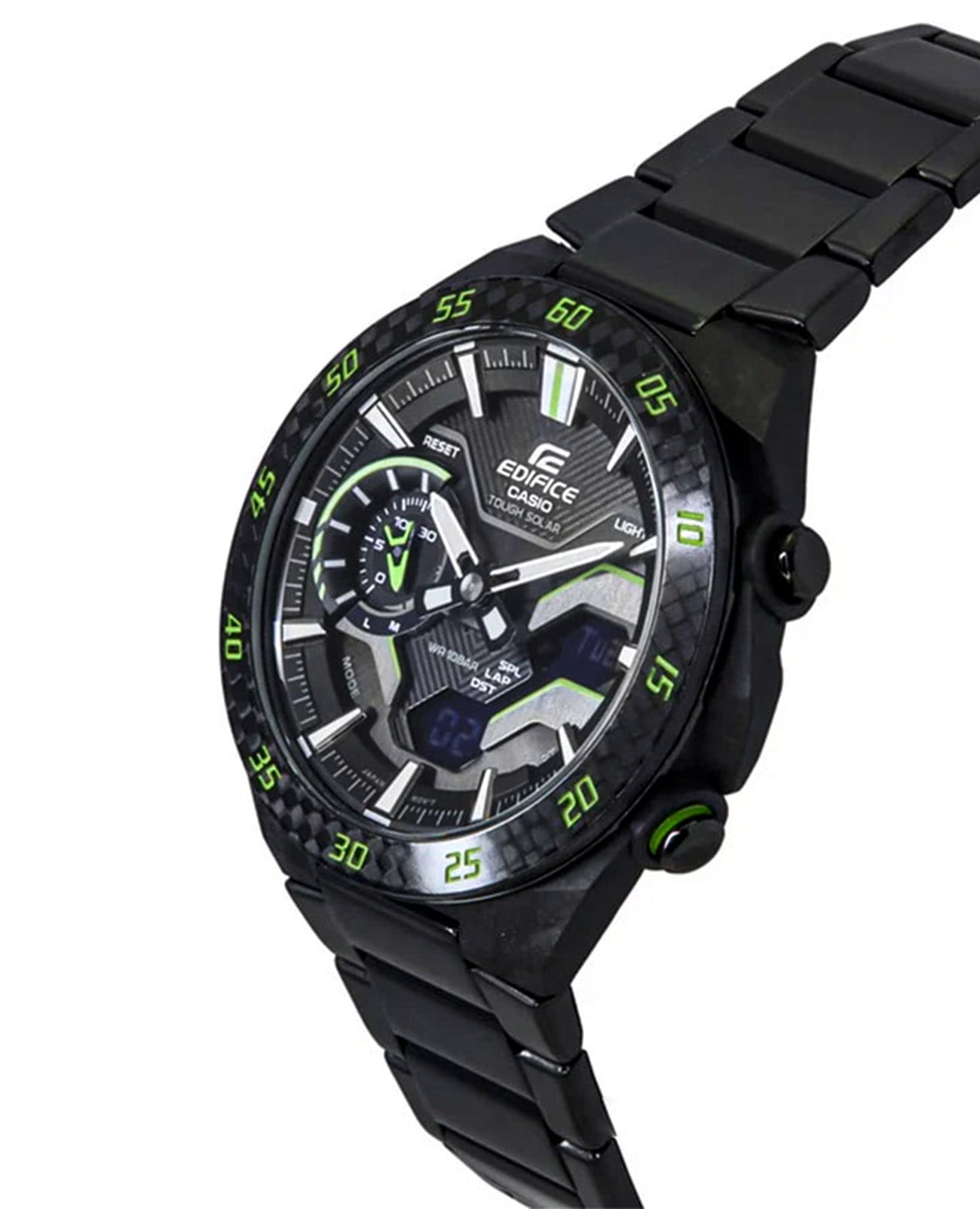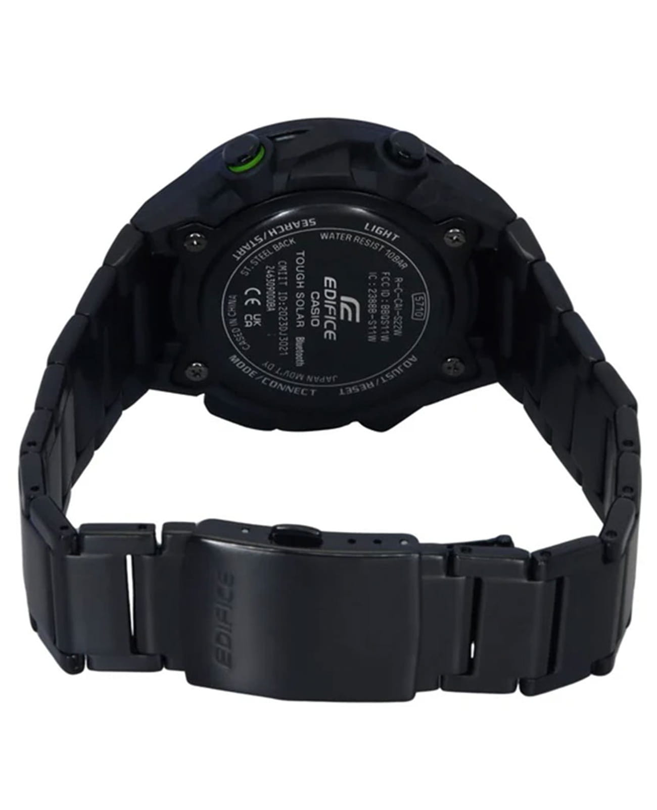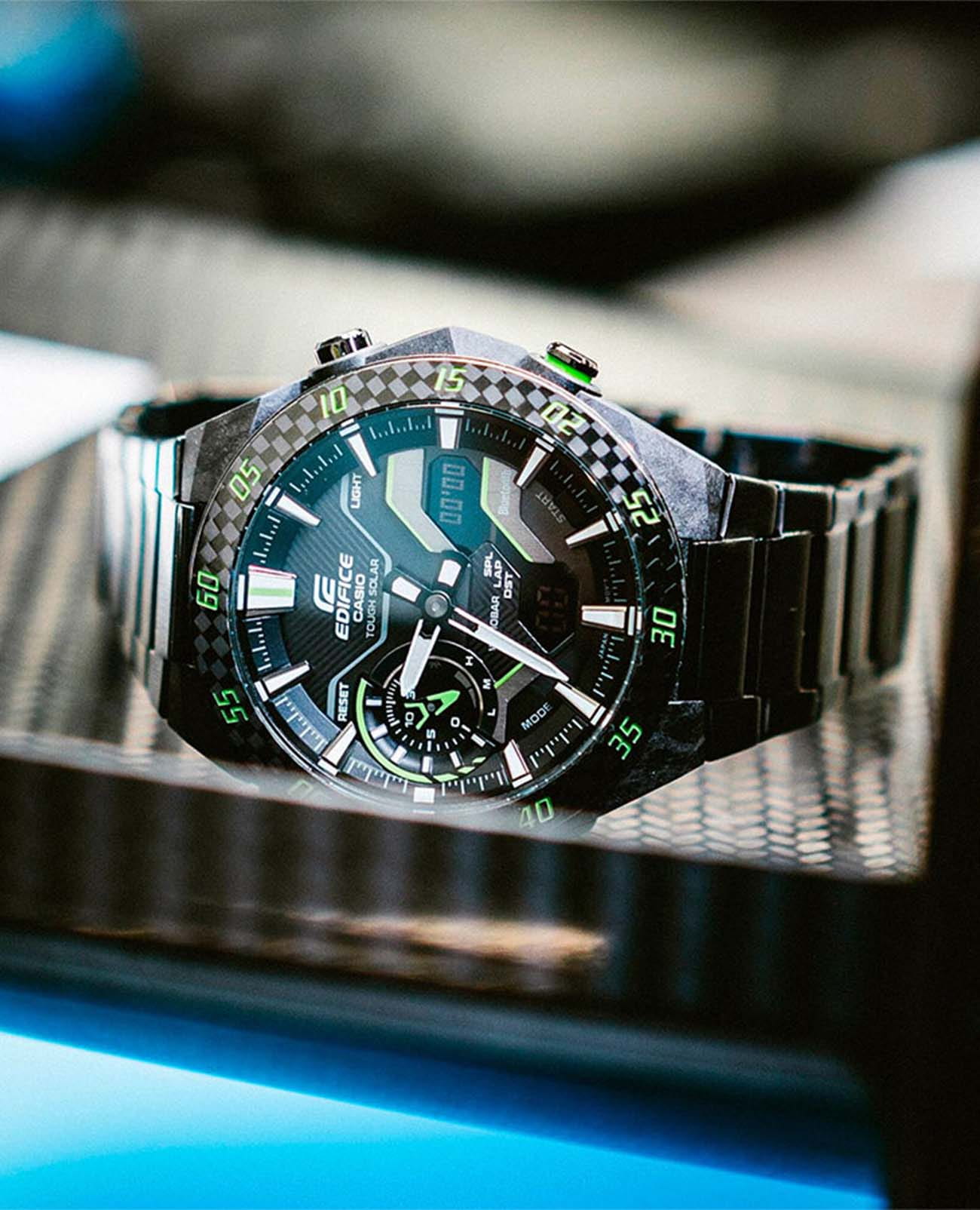 Модель Casio Edifice ECB-2200RC-1A3 из коллекции Edifice сочетает передовые технологии и динамичный спортивный стиль. Корпус выполнен из углеродного волокнаCarbon Core Guard Новейшая структура корпуса, разработанная Casio. Полиуретановая пластина дополнительно усилена карбоновыми вставками, что придаёт специальную защиту от механических повреждений. Карбон отличается лёгкостью и прочностью., усиленного смолой, что обеспечивает прочность и легкость и стальной безельБезельВнешний ободок, закрепляющий стекло. В спортивных часах так называется поворотное кольцо с делениями на циферблате, выполняет роль таймера – замеряет отрезки времени на шкале. Неподвижный безель – элемент декора. Однонаправленно вращающийся безель на дайверских часах позволяет фиксировать моменты погружения и выныривания на поверхность. с PVD-покрытиемPVDУльтратонкое покрытие наносится в технике вакуумного напыления, сочетает в себе нитрид титана особой прочности со слоем золота или оксида хрома. Несёт в себе декоративную или защитную функцию.. Циферблат с металлическими метками и объемными элементами подчеркивает автоспортивный характер модели. Часы оснащены Bluetooth®-синхронизациейBluetoothСовременная технология, позволяющая синхронизировать часы с телефоном и переносить данные. Часы с Bluetooth расширяют возможности вашего смартфона и делают его использование ещё более удобным., позволяющей автоматически корректировать время, управлять мировым временемМировое время Полезное часовое усложнение, отображающее время в основных городах и известных областях по всему миру, оно связано с часовыми поясами, удобно для путешественников и бизнесменов. и передавать данные секундомера через приложение CASIO WATCHES. Солнечная батарея Tough SolarTough SolarТехнология основана на подзарядке аккумулятора от источника солнечного света, специальная панель улавливает солнечные лучи и преобразует их в энергию для работы часов. Достаточно пары минут нахождения на солнце для функционирования часов в течении суток. преобразует свет в энергию, обеспечивая бесперебойную работу. Дополнительные функции включают таймер обратного отсчетаТаймерОтсчитывает секунды в обратном направлении в заданном интервале времени. с индикатором на отметке 9 часов, будильникБудильникБуди́льник — часы, в заданный момент времени подающие звуковой, световой и/или в редких случаях другой сигнал., секундомерСекундомерСекундоме́р — прибор, способный измерять интервалы времени с точностью до долей секунды. и двойную светодиодную подсветку Super IlluminatorСветодиодная подсветкаСветодиодная или LED-подсветка обеспечивает появление яркого холодного свечения за счёт LED-элементов - маленьких лампочек. Они потребляют минимальное количество энергии, чаще всего можно встретить 1 светодиод, в нижней части циферблата. для удобного чтения показаний в темноте. Стальной браслет с IP-покрытиемIP-покрытиеМетод ионного напыления. Демонстрирует повышенную устойчивость к истиранию, окислению и химическим веществам. Под воздействием высокого давления и температуры около 1500°C молекулы металла надёжно соединяются с частицами корпуса часов. на раскладной застёжкеРаскладная застёжкаТакой тип застёжки используется только на браслетах из металла. Она никогда не раскрывается полностью, происходит разделение на 2 и более частей. Раскладывающая зас