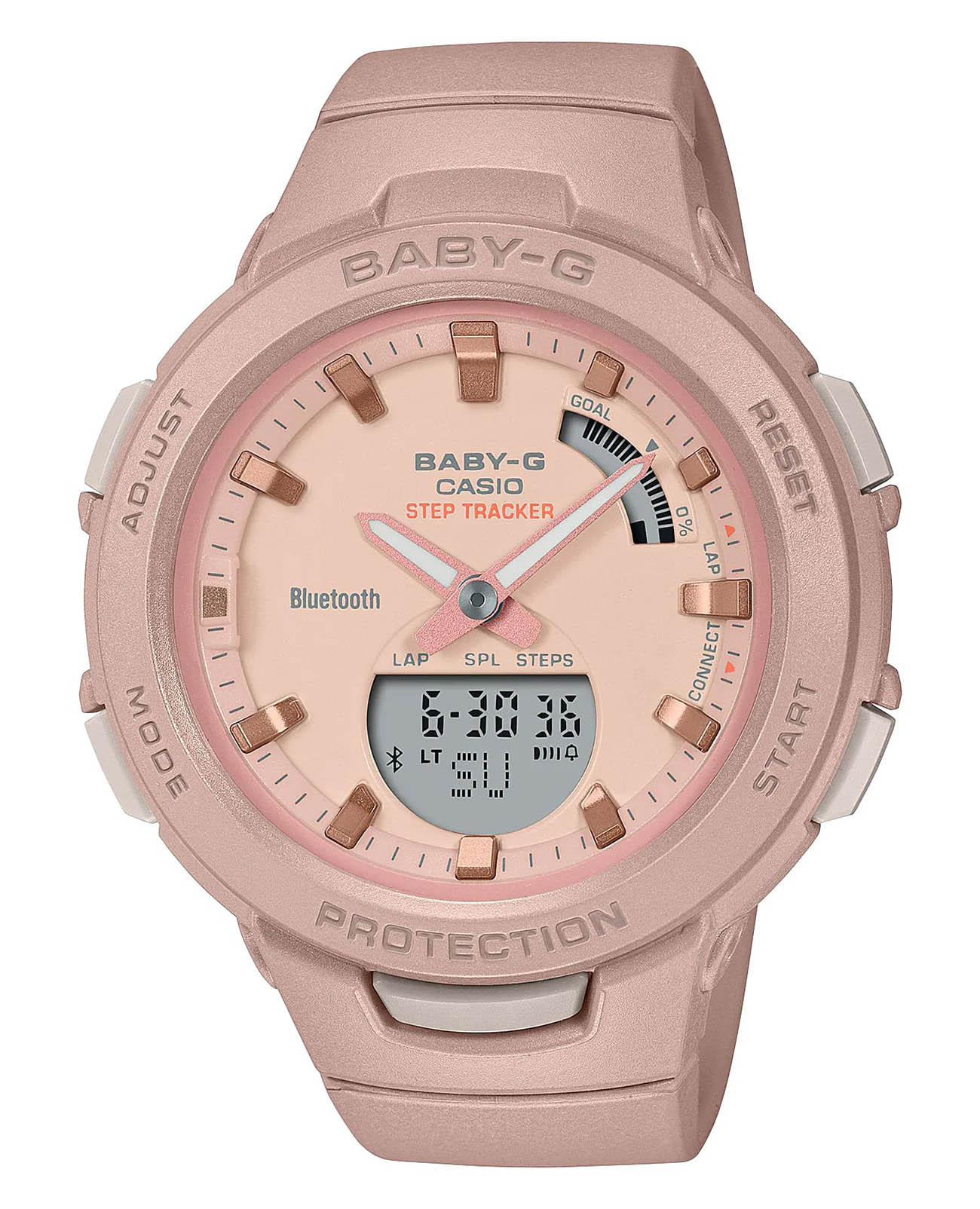 Женские японские часы Casio Baby-G BSA-B100CS-4A из спортивной коллекции Baby-G подойдут любительницам активности. Функциональная модель оснащена шагомером, позволяющим повысить эффективность занятий. Измеряется количество шагов от 0 до 999999, есть возможность установки ежедневной цели. Звуковой сигнал уведомляет об отсутствии активности. Технология Bluetooth 4.0BluetoothСовременная технология, позволяющая синхронизировать часы с телефоном и переносить данные. Часы с Bluetooth расширяют возможности вашего смартфона и делают его использование ещё более удобным. позволяет хранить информацию в приложении на смартфоне Baby-G Connected. Японский кварцевый механизм получает энергию от батарейки, рассчитанной на 2 года. Противоударный корпусУдаропрочный корпусМеханизм заключён в корпус, выполненный из современных материалов, устойчивых к ударам, механическим повреждениям и падению с высоты: инновационный пластик, карбон, нержавеющая сталь, титан. отражает силу удара, устойчив к падению, вибрации. Минеральное стекло. Светодиодная подсветкаСветодиодная подсветкаСветодиодная или LED-подсветка обеспечивает появление яркого холодного свечения за счёт LED-элементов - маленьких лампочек. Они потребляют минимальное количество энергии, чаще всего можно встретить 1 светодиод, в нижней части циферблата.. Водонепроницаемость 100 метров. Мировое времяМировое время Полезное часовое усложнение, отображающее время в основных городах и известных областях по всему миру, оно связано с часовыми поясами, удобно для путешественников и бизнесменов. - 300 городов, поиск телефона, таймер, будильник. Память на 200 результатов. Габариты: 49,6 x 41,4 x 12,6 мм.