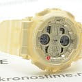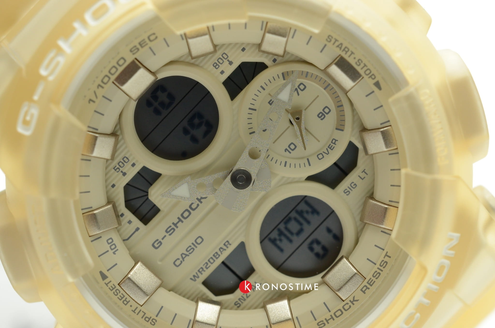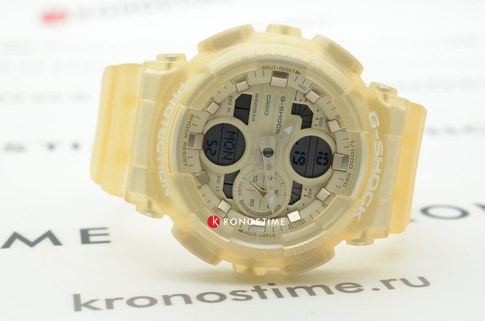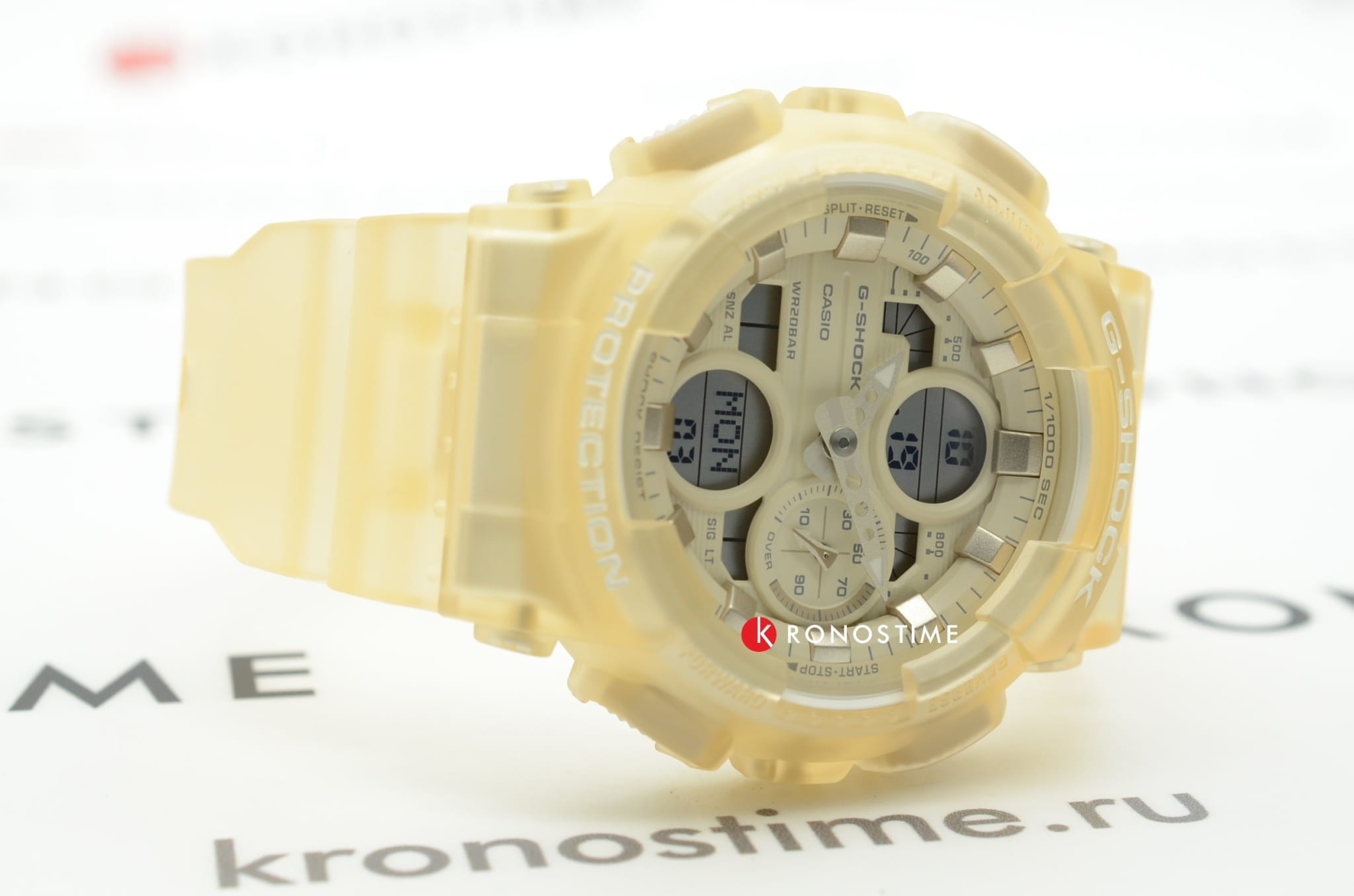 Компактный аксессуар имеет дизайн в скелетонизорованном формате. Полимерный корпус и ремешок бежевого цвета изготовлены в полупрозрачном исполнении. Циферблат с минеральным стеклом наделён винтажными элементами: окошки и стрелки оформлены в духе музыкальных проигрывателей эпохи 90-х. Модель обладает противоударным корпусомУдаропрочный корпусМеханизм заключён в корпус, выполненный из современных материалов, устойчивых к ударам, механическим повреждениям и падению с высоты: инновационный пластик, карбон, нержавеющая сталь, титан., выдерживающим удары, вибрации, падение с высоты. Наручные часы станут идеальным вариантом для девушки, придерживающейся активного образа жизни. Японский кварцевый калибр характеризуется точностью хода +/- 15 секунд в месяц. Он работает от батарейки с 2-летним сроком службы. Часы подходят для плавания и ныряния, так как сохраняют водонепроницаемость при давлении до 20 бар. Циферблат подсвечивается LED-диодом Светодиодная подсветкаСветодиодная или LED-подсветка обеспечивает появление яркого холодного свечения за счёт LED-элементов - маленьких лампочек. Они потребляют минимальное количество энергии, чаще всего можно встретить 1 светодиод, в нижней части циферблата., функция автоподсветки активируется при поднесении часов к лицу. Функции: секундомер с точностью в 1/1000 секунды, хронографХронографФункция позволяет измерять отрезки времени с особой точностью: часы, минуты, секунды. Верным признаком хронографа является наличие на циферблате 3 дополнительных окошек-счётчиков., будильник, мировое времяМировое время Полезное часовое усложнение, отображающее время в основных городах и известных областях по всему миру, оно связано с часовыми поясами, удобно для путешественников и бизнесменов. – 48 городов, календарь, таймер, индикация средней скорости пройденного маршрута. Габариты: 49 x 45,9 x 15,8 мм.