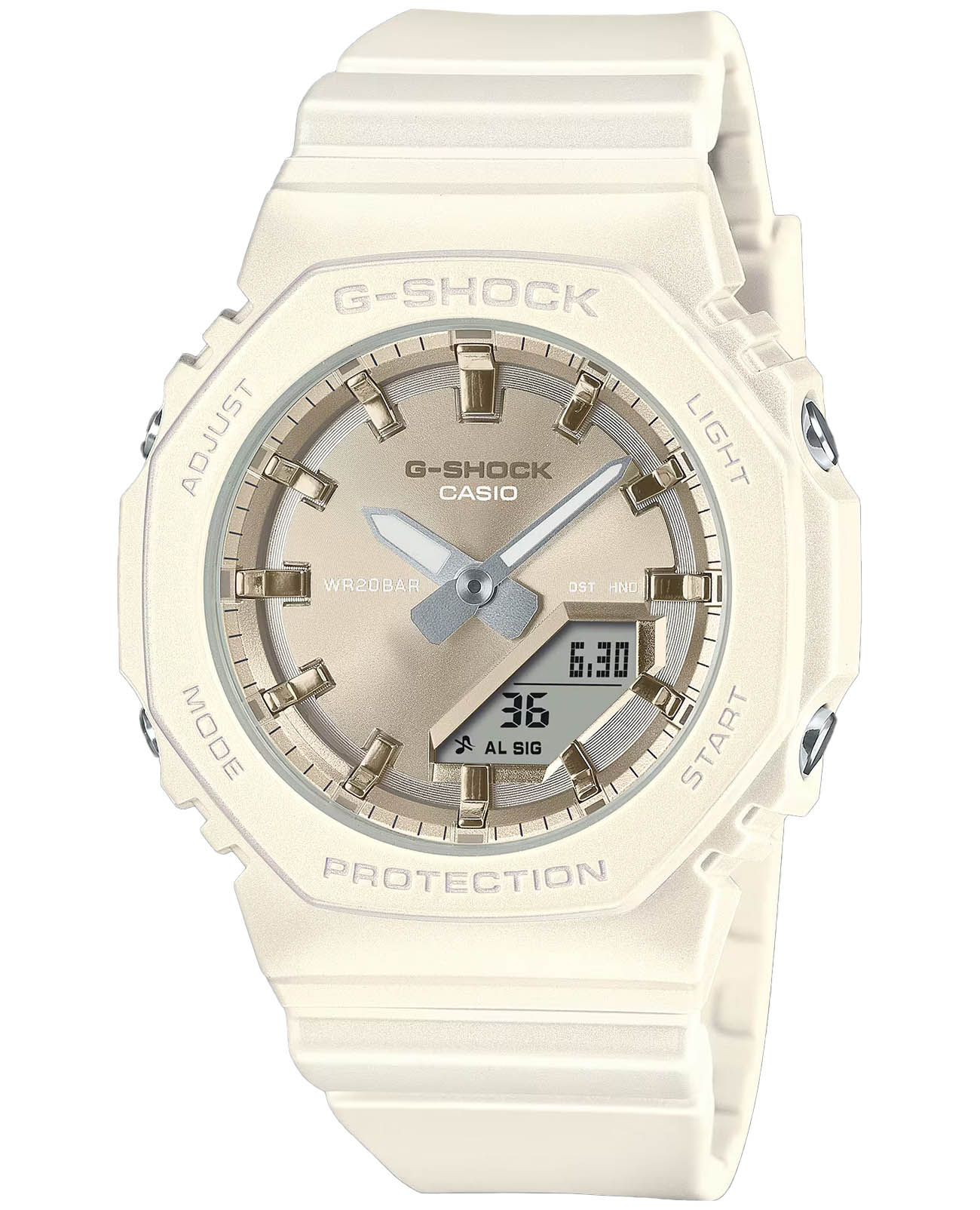 Женские кварцевые часы Casio G-Shock GMA-P2100ST-7A. Корпус часов изготовлен из пластика. Стрелки с люминесцентным покрытиемЛюминесцентное покрытиеПозволяет считывать показания времени в темноте. Производители наносят на стрелки, часовые индексы, безель или поверхность циферблата светонакопительный состав, дающий холодное свечение.. Водозащита: 200 метров, позволит плавать, нырять и заниматься другими водными видами спорта. Минеральное стеклоМинеральное стеклоМинеральное стекло представляет собой искусственно выращенный минерал кварца. Такое стекло отличается особой устойчивостью к повреждениям и царапинам. Уступает по некоторым качествам сапфировому стеклу. устойчивое к появлению царапин, обладающее высокой прозрачностью.