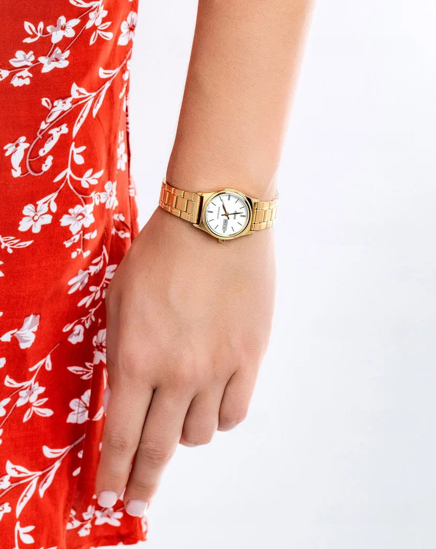Японские женские часы с минеральным стекломМинеральное стеклоМинеральное стекло представляет собой искусственно выращенный минерал кварца. Такое стекло отличается особой устойчивостью к повреждениям и царапинам. Уступает по некоторым качествам сапфировому стеклу. из коллекции LTP изящно смотрятся на запястье, они привлекают классическим исполнением и правильной геометрией. Минималистичная модель станет отличным решением для любого случая: на работу, переговоры с деловыми партнёрами, прогулку с друзьями или праздничный вечер. Отсутствуют лишние детали, что позволяет часам быть актуальными на долгие годы. Корпус выполнен из нержавеющей стали с IP-покрытиемIP-покрытиеМетод ионного напыления. Демонстрирует повышенную устойчивость к истиранию, окислению и химическим веществам. Под воздействием высокого давления и температуры около 1500°C молекулы металла надёжно соединяются с частицами корпуса часов.. Модель комплектуется надёжным механизмом, точность хода которого составляет +/- 20 сек/мес.