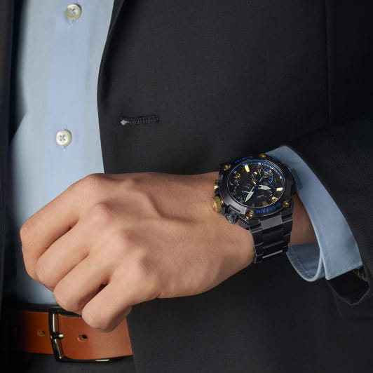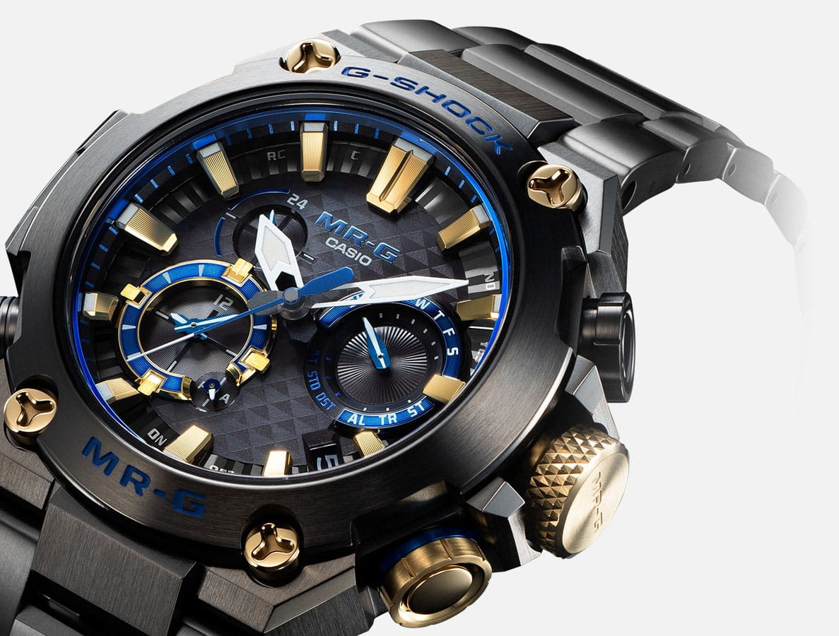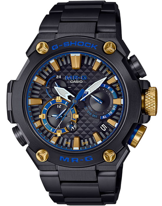 Японские часы Casio G-Shock MRG-B2000B-1ADR из самой престижной коллекции MR-G сочетает исполнение премиум-класса с беспрецедентной прочностью и самым полным функционалом. В дизайне этих часов использован традиционный японский цвет, известный как качи-иро (цвет победы). Темно-синий цвет имеет давнюю историю в Японии - победный цвет качи-иро предпочитался самураями и часто использовался для изготовления доспехов и шлемов. Новая модель MR-G в полной мере отражает сам дух воина-самурая. Комбинированный корпус Casio G-Shock MR-G выполнен из полимерного материала и высокотехнологичного титанового сплава с эксклюзивной финишной обработкой. Подстать дизайну корпуса, хорошо узнаваемому и в тоже время совершенно новому, и современный многофункциональный механизм с системой управления Smart Access, работающий на солнечных батареях и имеющий, помимо привычных секундомера и будильника, технологии Bluetooth® и Multi Band 6, которые поддерживают автоматическую настройку времени по радиосигналам и помощью приложения G-Shock Connected, установленного в смартфоне.