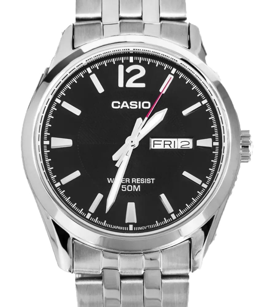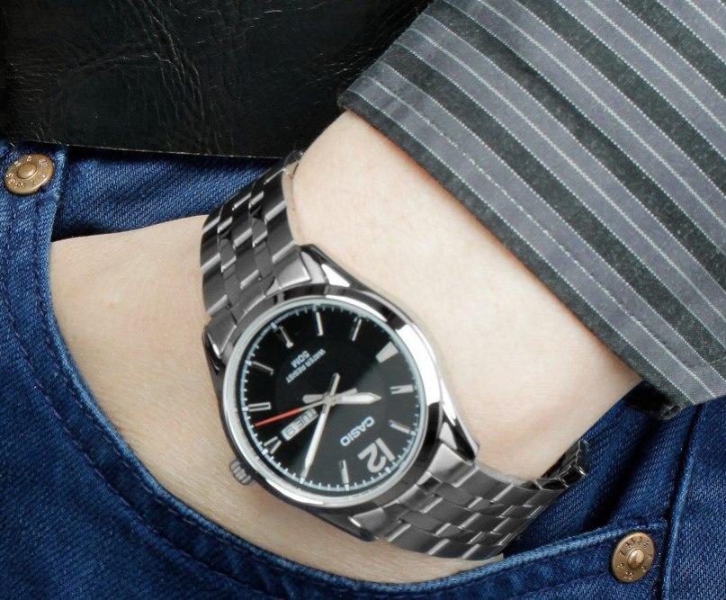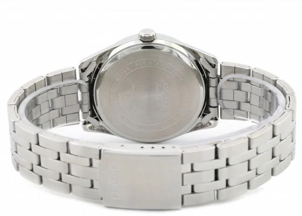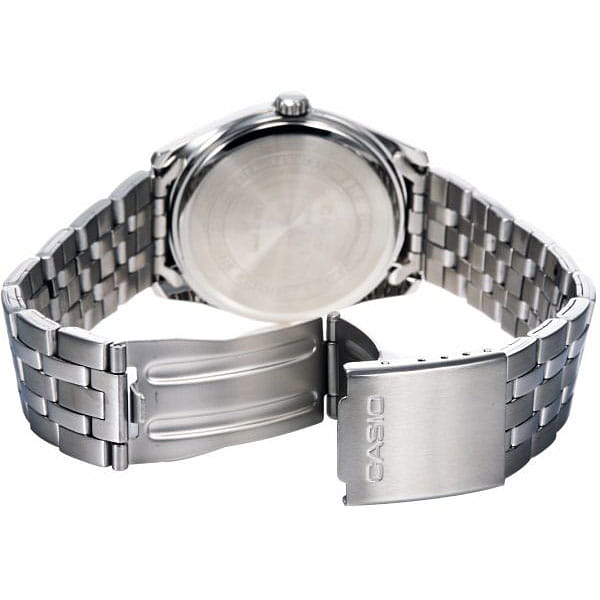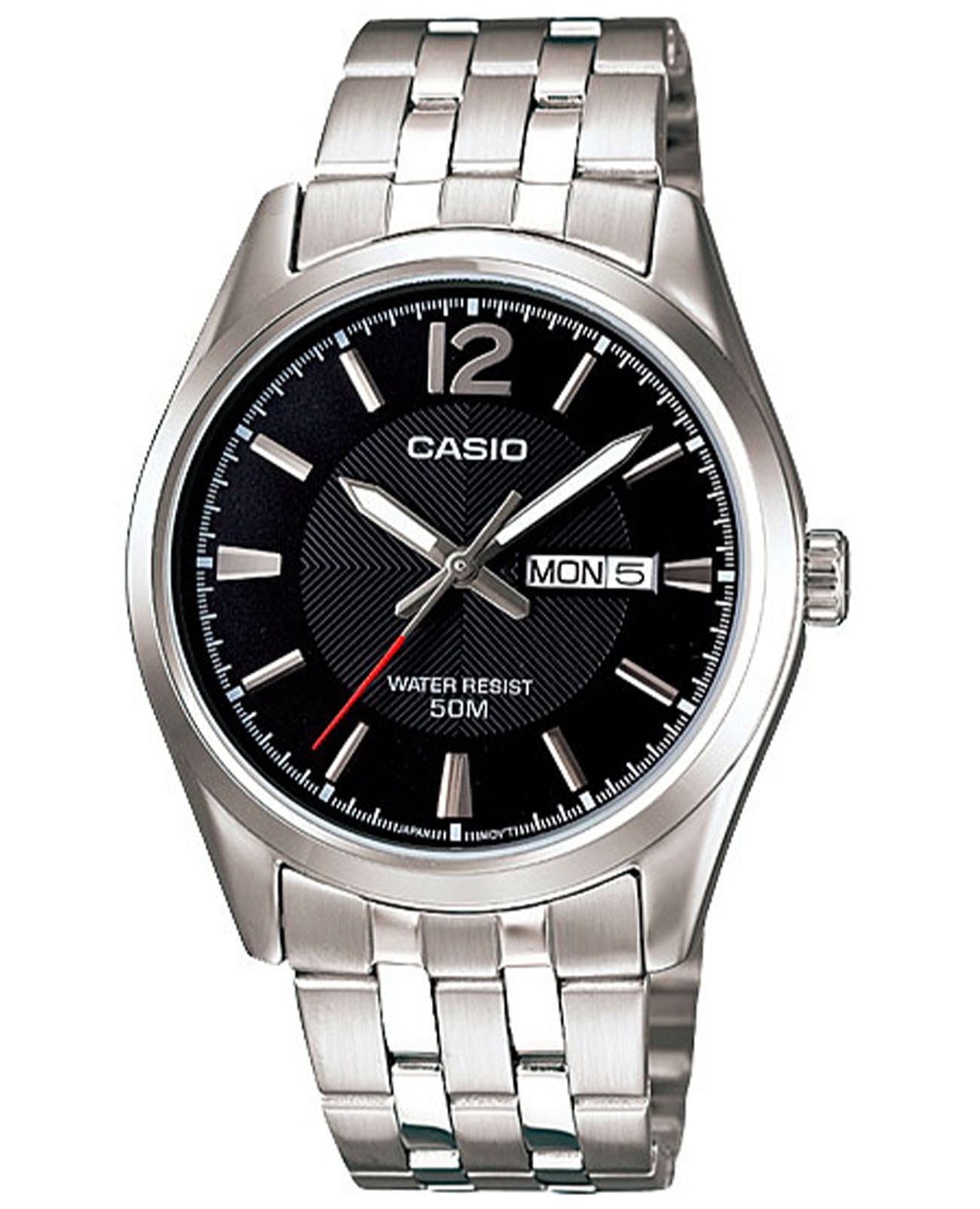 Японские мужские часы с минеральным стекломМинеральное стеклоМинеральное стекло представляет собой искусственно выращенный минерал кварца. Такое стекло отличается особой устойчивостью к повреждениям и царапинам. Уступает по некоторым качествам сапфировому стеклу. Casio MTP-1335D-1A, кварцевый механизм с высокой точностью. Класс водозащиты: 50 метров, позволит защитить корпус от случайных брызг или капель дождя. Корпус часов изготовлен из стали. Стальной браслет на раскладной застёжкеРаскладная застёжкаТакой тип застёжки используется только на браслетах из металла. Она никогда не раскрывается полностью, происходит разделение на 2 и более частей. Раскладывающая застёжка снизит вероятность потери часов к минимуму.. Стрелки с люминесцентным покрытиемЛюминесцентное покрытиеПозволяет считывать показания времени в темноте. Производители наносят на стрелки, часовые индексы, безель или поверхность циферблата светонакопительный состав, дающий холодное свечение.. Окошки дня недели и даты находятся в положении 3 часа.