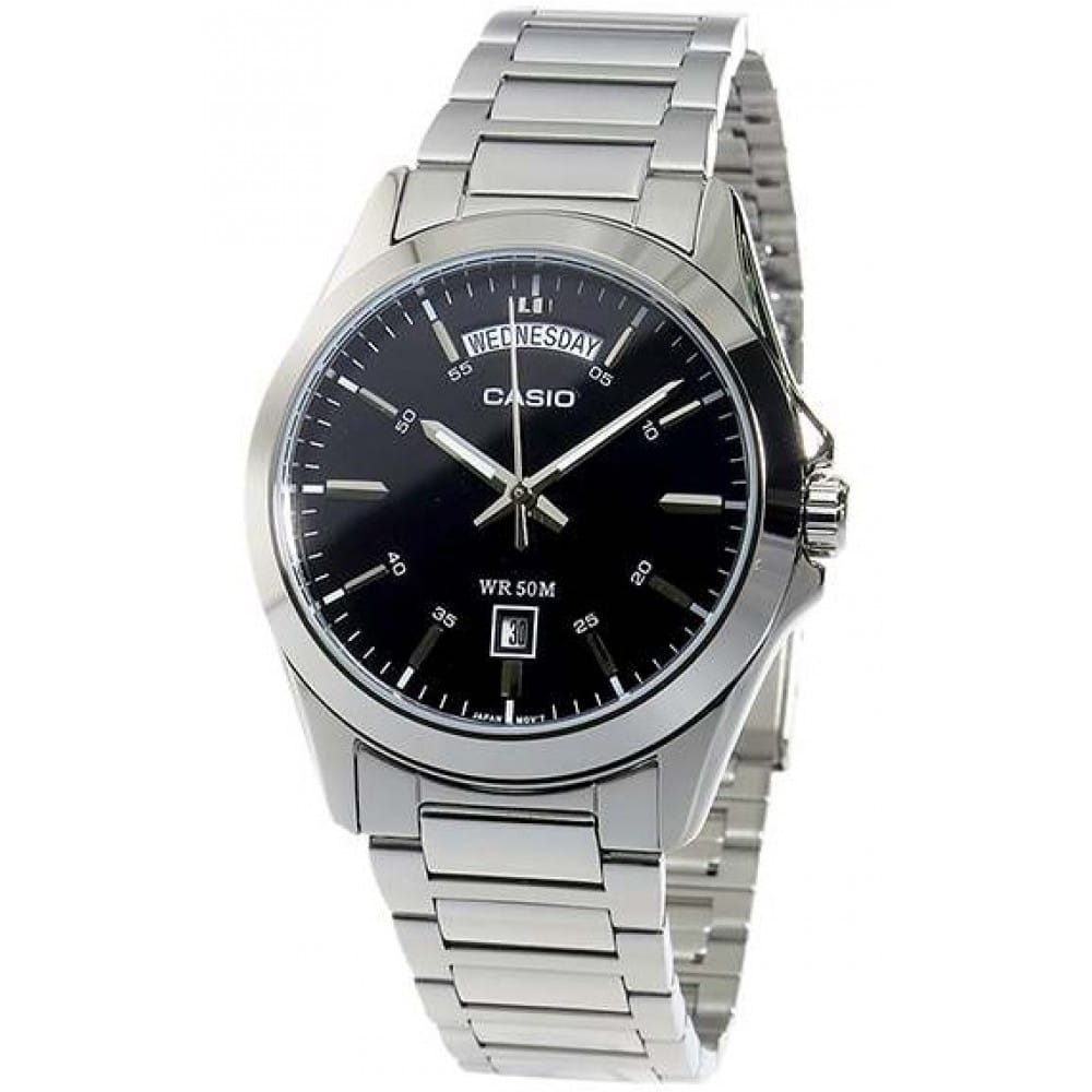 Японские мужские наручные часы с минеральным стекломМинеральное стеклоМинеральное стекло представляет собой искусственно выращенный минерал кварца. Такое стекло отличается особой устойчивостью к повреждениям и царапинам. Уступает по некоторым качествам сапфировому стеклу. Casio MTP-1370D-1A2, кварцевый механизм с высокой точностью. Класс водозащиты: 50 метров, позволит защитить корпус от случайных брызг или капель дождя. Корпус часов изготовлен из латуни. Стальной браслет на раскладной застёжке. Окошко даты находится в положении 6 часов. Заводная головка с защитой. Стрелки с люминесцентным покрытиемЛюминесцентное покрытиеПозволяет считывать показания времени в темноте. Производители наносят на стрелки, часовые индексы, безель или поверхность циферблата светонакопительный состав, дающий холодное свечение..