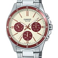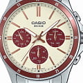Японские мужские наручные часы с минеральным стекломМинеральное стеклоМинеральное стекло представляет собой искусственно выращенный минерал кварца. Такое стекло отличается особой устойчивостью к повреждениям и царапинам. Уступает по некоторым качествам сапфировому стеклу. Casio Collection MTP-1374D-5A2V2, кварцевый механизм с высокой точностью. Класс водозащиты: 50 метров, позволит защитить корпус от случайных брызг или капель дождя. Корпус часов изготовлен из стали. Стальной браслет на раскладной застёжкеРаскладная застёжкаТакой тип застёжки используется только на браслетах из металла. Она никогда не раскрывается полностью, происходит разделение на 2 и более частей. Раскладывающая застёжка снизит вероятность потери часов к минимуму.. Стрелки с люминесцентным покрытиемЛюминесцентное покрытиеПозволяет считывать показания времени в темноте. Производители наносят на стрелки, часовые индексы, безель или поверхность циферблата светонакопительный состав, дающий холодное свечение.. 12-ти и 24-х часовой формат времени, число и день недели вынесены на отдельные циферблаты. Метки в виде штрихов. Заводная головка с защитой. БезельБезельВнешний ободок, закрепляющий стекло. В спортивных часах так называется поворотное кольцо с делениями на циферблате, выполняет роль таймера – замеряет отрезки времени на шкале. Неподвижный безель – элемент декора. Однонаправленно вращающийся безель на дайверских часах позволяет фиксировать моменты погружения и выныривания на поверхность. с IP-покрытиемIP-покрытиеМетод ионного напыления. Демонстрирует повышенную устойчивость к истиранию, окислению и химическим веществам. Под воздействием высокого давления и температуры около 1500°C молекулы металла надёжно соединяются с частицами корпуса часов..