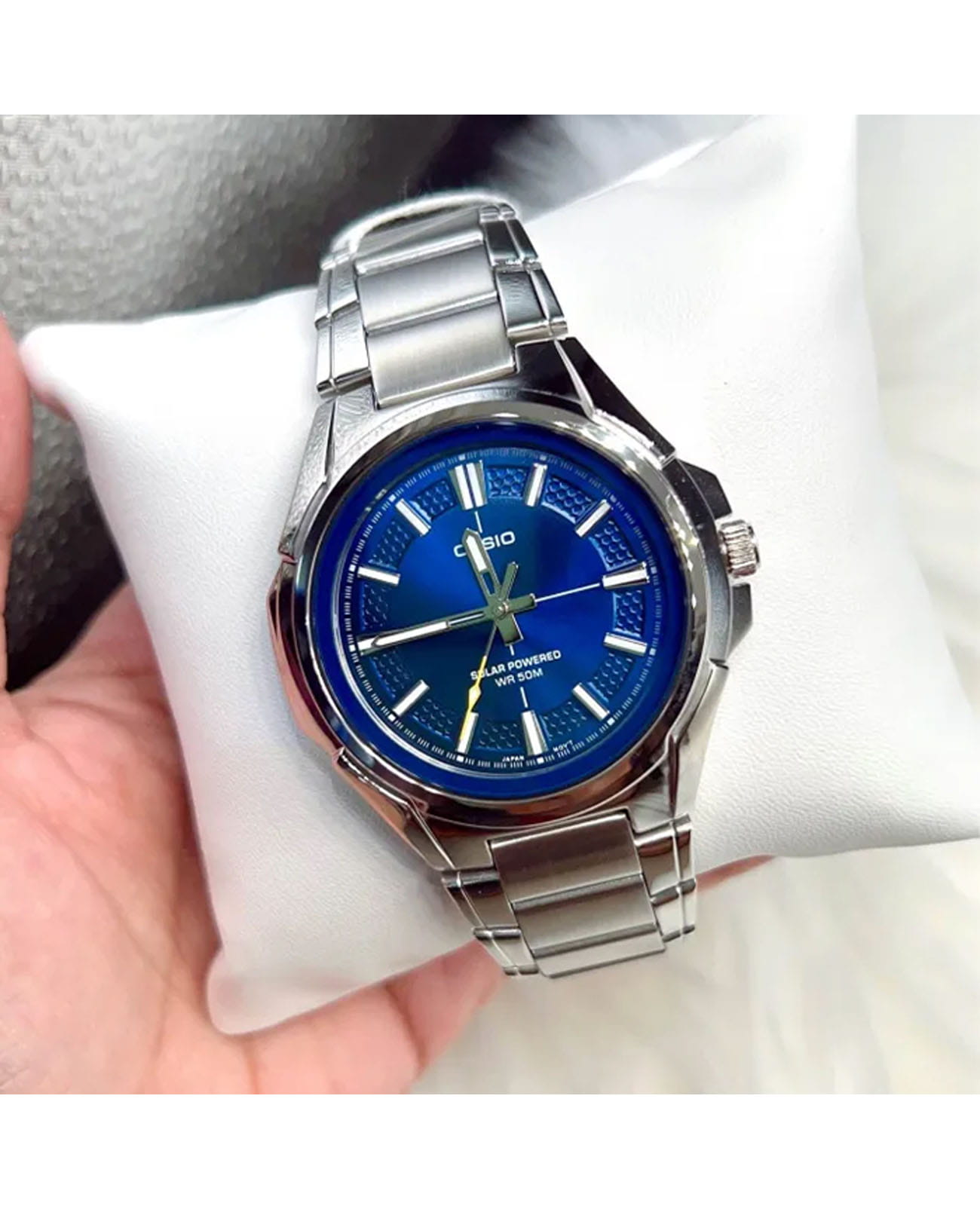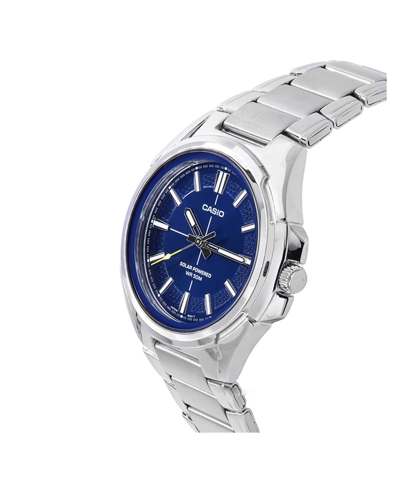 Японские мужские кварцевые часы с минеральным стекломМинеральное стеклоМинеральное стекло представляет собой искусственно выращенный минерал кварца. Такое стекло отличается особой устойчивостью к повреждениям и царапинам. Уступает по некоторым качествам сапфировому стеклу. Casio Collection MTP-RS100D-2A, кварцевый механизм с высокой точностью. Корпус часов изготовлен из нержавеющей стали. Питание от солнечной энергии. Время работы - 4 месяца. Циферблат с метками в виде штрихов выполнен по технологии Sunray (солнечные лучи). Циферблат с метками в виде штрихов. Стрелки и метки с люминесцентным покрытиемЛюминесцентное покрытиеПозволяет считывать показания времени в темноте. Производители наносят на стрелки, часовые индексы, безель или поверхность циферблата светонакопительный состав, дающий холодное свечение.. Заводная головка с защитой. Класс водозащиты: 50 метров, позволит защитить корпус от случайных брызг или капель дождя. Стальной браслет на раскладной застёжкеРаскладная застёжкаТакой тип застёжки используется только на браслетах из металла. Она никогда не раскрывается полностью, происходит разделение на 2 и более частей. Раскладывающая застёжка снизит вероятность потери часов к минимуму..