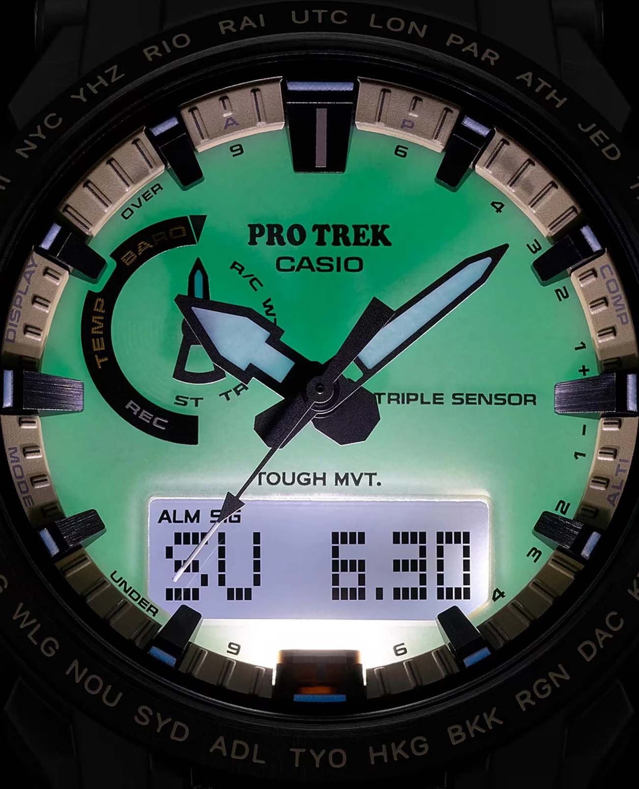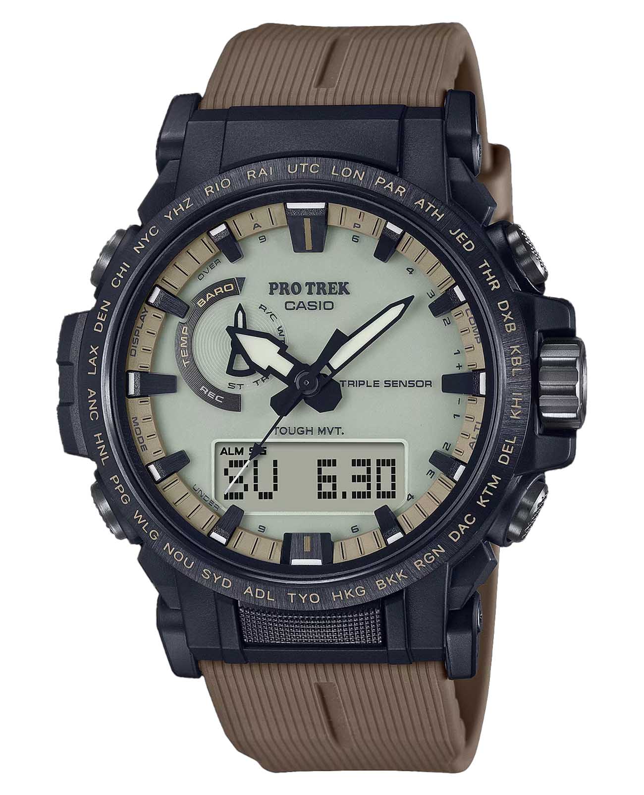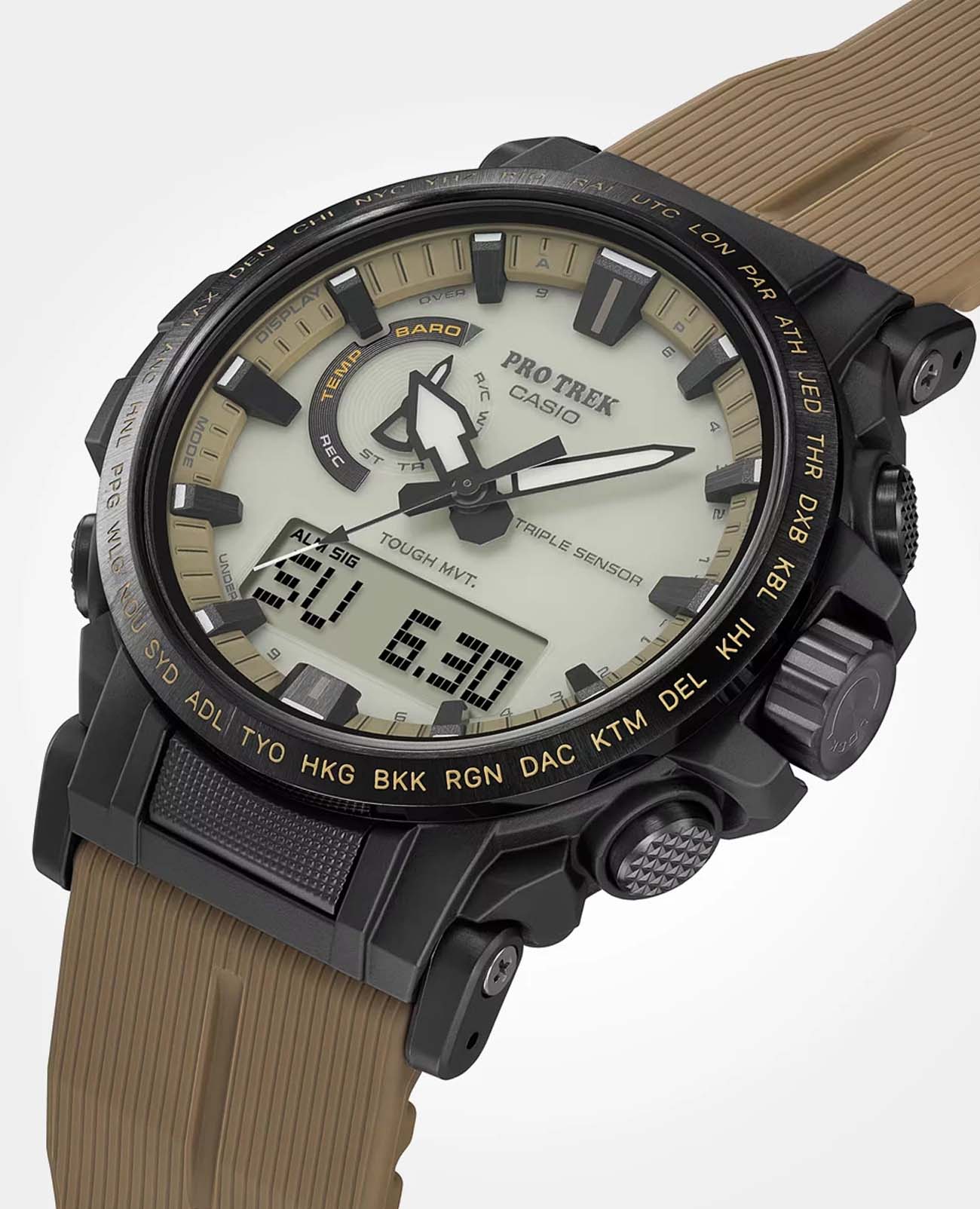 В целом же, дизайн корпуса PRW-61 остался узнаваем и даже с такой начинкой, в которой можно отметить водонепроницаемость корпуса, термометр, барометр, высотомер, цифровой компас, Tough SolarTough SolarТехнология основана на подзарядке аккумулятора от источника солнечного света, специальная панель улавливает солнечные лучи и преобразует их в энергию для работы часов. Достаточно пары минут нахождения на солнце для функционирования часов в течении суток. и радио-синхронизацию, часы отлично подходят в качестве ежедневного аксессуара для жителя современного города. Минеральное стеклоМинеральное стеклоМинеральное стекло представляет собой искусственно выращенный минерал кварца. Такое стекло отличается особой устойчивостью к повреждениям и царапинам. Уступает по некоторым качествам сапфировому стеклу. устойчивое к появлению царапин, обладающее высокой прозрачностью.