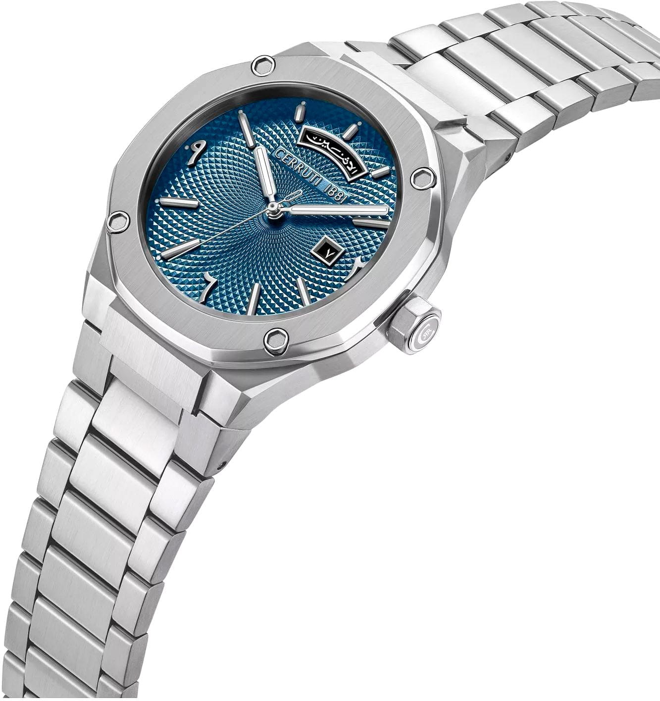 Cerruti 1881 CIWGH0084802 — утончённые мужские часы, в которых классика и современная геометрия нашли безупречный баланс. Стальной корпус с восьмигранным безелемБезельВнешний ободок, закрепляющий стекло. В спортивных часах так называется поворотное кольцо с делениями на циферблате, выполняет роль таймера – замеряет отрезки времени на шкале. Неподвижный безель – элемент декора. Однонаправленно вращающийся безель на дайверских часах позволяет фиксировать моменты погружения и выныривания на поверхность. подчёркивает архитектурную точность форм, а глубокий циферблат с гильошированным узором придаёт модели выразительную глубину. Индикаторы дня недели и даты оформлены в элегантных окнах на «12» и «3 часах», обеспечивая визуальную симметрию и удобство считывания. Прочные стрелки покрыты люминесцентным покрытиемЛюминесцентное покрытиеПозволяет считывать показания времени в темноте. Производители наносят на стрелки, часовые индексы, безель или поверхность циферблата светонакопительный состав, дающий холодное свечение., что гарантирует отличную читаемость даже в темноте. Циферблат защищён надёжным минеральным стекломМинеральное стеклоМинеральное стекло представляет собой искусственно выращенный минерал кварца. Такое стекло отличается особой устойчивостью к повреждениям и царапинам. Уступает по некоторым качествам сапфировому стеклу., устойчивым к царапинам, а стальной браслет фиксируется удобной застёжкой «бабочка»Застёжка "бабочка"Такой вид застёжки дополняется предохранителями, помогающими избежать случайного раскрытия браслета. Обладают изящным исполнением. , обеспечивающей комфорт и безопасность при носке. Строгая форма и продуманные детали делают эту модель идеальным выбором для мужчины, ценящего сдержанную роскошь и точность швейцарского стиля.