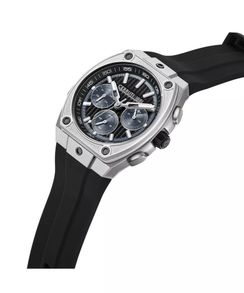 Cerruti 1881 CIWGO0085001 — эффектные мужские часы, сочетающие индустриальную мощь и современную элегантность. Корпус из нержавеющей стали с массивным восьмигранным безелемБезельВнешний ободок, закрепляющий стекло. В спортивных часах так называется поворотное кольцо с делениями на циферблате, выполняет роль таймера – замеряет отрезки времени на шкале. Неподвижный безель – элемент декора. Однонаправленно вращающийся безель на дайверских часах позволяет фиксировать моменты погружения и выныривания на поверхность. и декоративными винтами подчёркивает силу и характер дизайна. Глубокий чёрный циферблат с тремя счётчиками хронографаХронографФункция позволяет измерять отрезки времени с особой точностью: часы, минуты, секунды. Верным признаком хронографа является наличие на циферблате 3 дополнительных окошек-счётчиков. и рельефной текстурой придаёт модели динамичность, а контрастные стрелки и метки с люминесцентным покрытиемЛюминесцентное покрытиеПозволяет считывать показания времени в темноте. Производители наносят на стрелки, часовые индексы, безель или поверхность циферблата светонакопительный состав, дающий холодное свечение. обеспечивают превосходную читаемость при любом освещении. Прочное минеральное стеклоМинеральное стеклоМинеральное стекло представляет собой искусственно выращенный минерал кварца. Такое стекло отличается особой устойчивостью к повреждениям и царапинам. Уступает по некоторым качествам сапфировому стеклу. защищает циферблат от царапин, а мягкий каучуковый ремешок обеспечивает комфорт при ежедневном ношении. Cerruti 1881 — это воплощение итальянского стиля, надёжности и уверенности, идеально подходящее для мужчин, ценящих современные формы и функциональную эстетику.