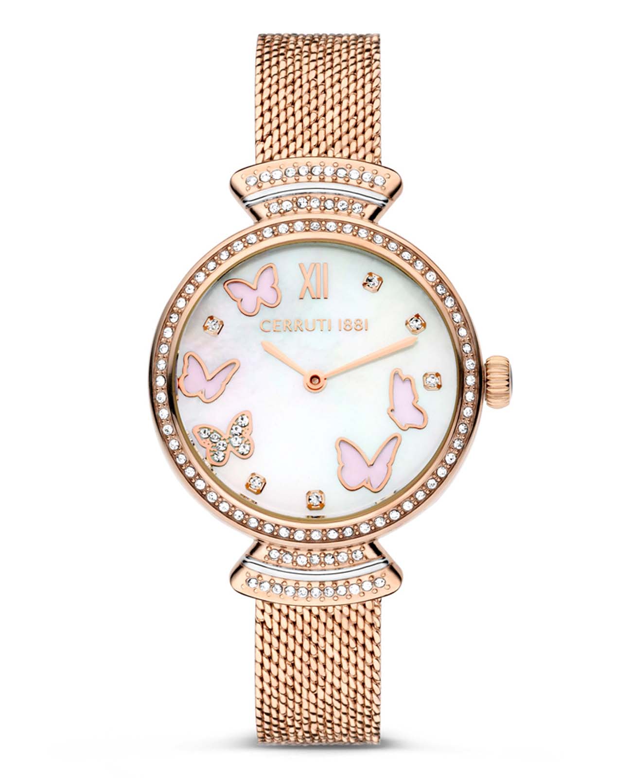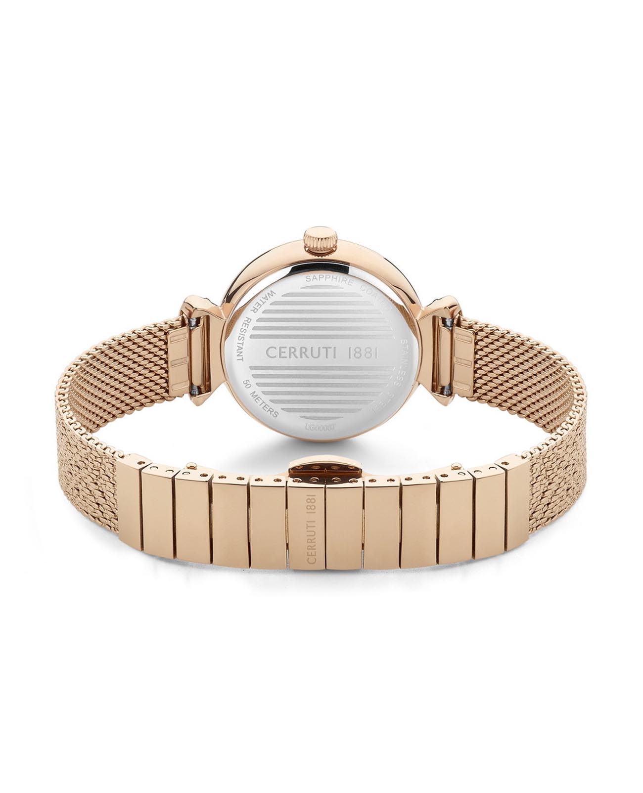 Французские женские часы с кристаллами Cerruti 1881 Cerrisi CIWLG0008703, кварцевый механизм с высокой точностью. Минеральное стеклоМинеральное стеклоМинеральное стекло представляет собой искусственно выращенный минерал кварца. Такое стекло отличается особой устойчивостью к повреждениям и царапинам. Уступает по некоторым качествам сапфировому стеклу. устойчивое к мелким механическим повреждениям. Корпус часов изготовлен из стали с IP-покрытиемIP-покрытиеМетод ионного напыления. Демонстрирует повышенную устойчивость к истиранию, окислению и химическим веществам. Под воздействием высокого давления и температуры около 1500°C молекулы металла надёжно соединяются с частицами корпуса часов.. БезельБезельВнешний ободок, закрепляющий стекло. В спортивных часах так называется поворотное кольцо с делениями на циферблате, выполняет роль таймера – замеряет отрезки времени на шкале. Неподвижный безель – элемент декора. Однонаправленно вращающийся безель на дайверских часах позволяет фиксировать моменты погружения и выныривания на поверхность. украшен кристаллами. Циферблат украшен кристаллами, римские метки. Класс водозащиты: 30 метров, позволит защитить корпус от случайных брызг или капель дождя. Стальной браслет миланского плетения с IP-покрытиемIP-покрытиеМетод ионного напыления. Демонстрирует повышенную устойчивость к истиранию, окислению и химическим веществам. Под воздействием высокого давления и температуры около 1500°C молекулы металла надёжно соединяются с частицами корпуса часов. на застёжке-бабочке с кнопкамиЗастёжка "бабочка"Такой вид застёжки дополняется предохранителями, помогающими избежать случайного раскрытия браслета. Обладают изящным исполнением. .