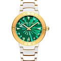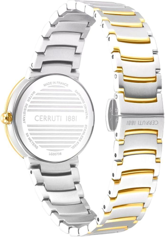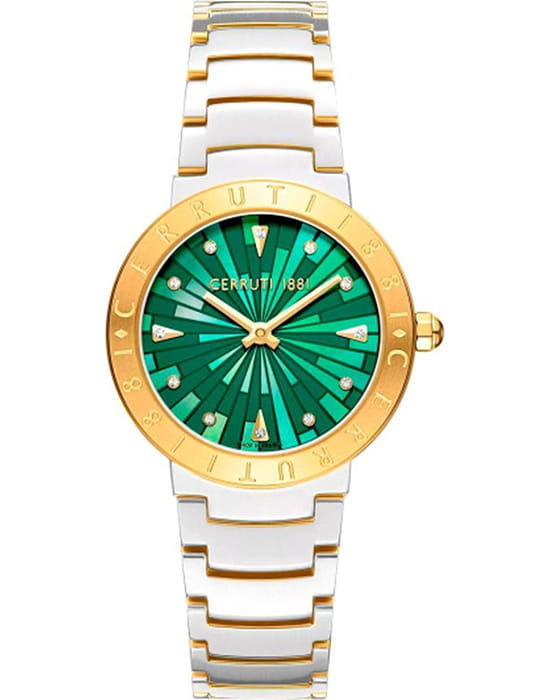 Cerruti 1881 CIWLG0073804 — элегантные женские часы, сочетающие классический стиль и сияние итальянской роскоши. Корпус из нержавеющей стали и браслет с частичным благородным золотым IP-покрытиемIP-покрытиеМетод ионного напыления. Демонстрирует повышенную устойчивость к истиранию, окислению и химическим веществам. Под воздействием высокого давления и температуры около 1500°C молекулы металла надёжно соединяются с частицами корпуса часов., подчёркивающим изысканность модели. БезельБезельВнешний ободок, закрепляющий стекло. В спортивных часах так называется поворотное кольцо с делениями на циферблате, выполняет роль таймера – замеряет отрезки времени на шкале. Неподвижный безель – элемент декора. Однонаправленно вращающийся безель на дайверских часах позволяет фиксировать моменты погружения и выныривания на поверхность. IP-покрытиемIP-покрытиеМетод ионного напыления. Демонстрирует повышенную устойчивость к истиранию, окислению и химическим веществам. Под воздействием высокого давления и температуры около 1500°C молекулы металла надёжно соединяются с частицами корпуса часов. и гравировкой логотипа Cerruti 1881 придаёт образу фирменную индивидуальность, а зеленый циферблат с лучевой текстурой и кристаллическими метками создаёт игру света и глубины. Прочное минеральное стеклоМинеральное стеклоМинеральное стекло представляет собой искусственно выращенный минерал кварца. Такое стекло отличается особой устойчивостью к повреждениям и царапинам. Уступает по некоторым качествам сапфировому стеклу. защищает поверхность от царапин, а металлический браслет с плавным переходом звеньев оснащён застёжкой «бабочка»Застёжка "бабочка"Такой вид застёжки дополняется предохранителями, помогающими избежать случайного раскрытия браслета. Обладают изящным исполнением. , обеспечивающей надёжность и комфорт при ношении. Cerruti 1881 — воплощение женственности и утончённого вкуса, идеально подходящее для повседневной элегантности и особых случаев.