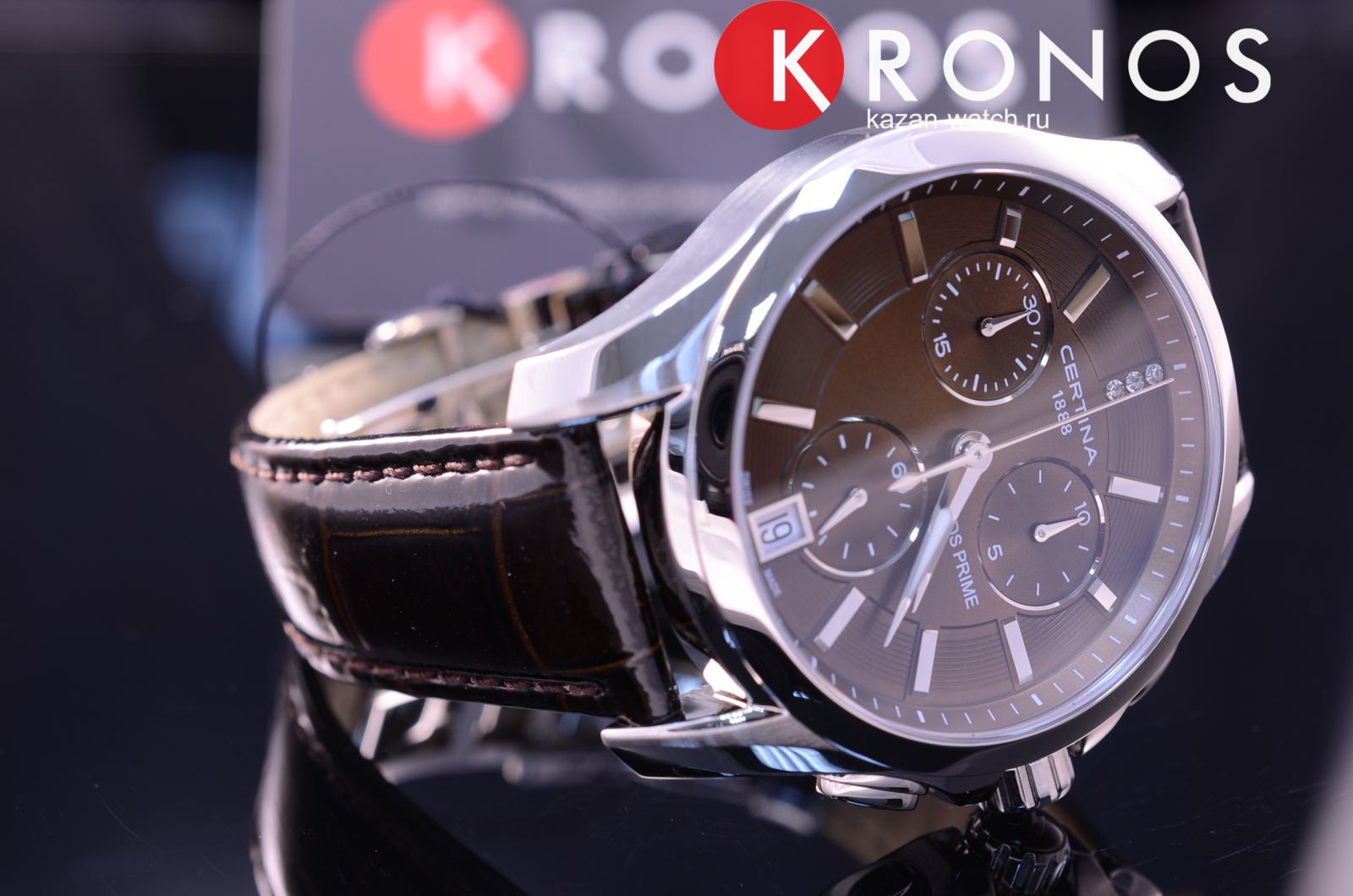 На метке 12 часов размещено 3 бриллианта оттенка Top Wesselton. ХронографХронографФункция позволяет измерять отрезки времени с особой точностью: часы, минуты, секунды. Верным признаком хронографа является наличие на циферблате 3 дополнительных окошек-счётчиков. характеризуется высокой точностью хода благодаря швейцарскому кварцевому механизму ETA G10.211. Ремешок выполнен из натуральной кожи, сапфировое стекло отличается антибликовой обработкой.
