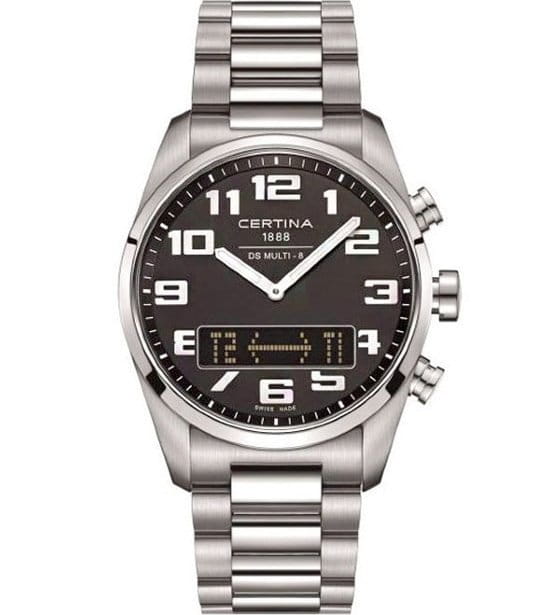 CERTINA C020.419.11.052.01 DS Multi-8 - мужские кварцевые наручные часы. Корпус этих часов среднего размера (42 мм) и выполнен из нержавеющей стали L316 металлического цвета. Модель CERTINA C020.419.11.052.01 DS Multi-8 имеет устойчивое к царапинам сапфировое стекло, браслет из нержавающей стали металлического цвета, черный циферблат. Калибр механизма: ETA 49.351. Класс водозащиты: 100 м / 10 АТМ (разрешается плавание и ныряние без акваланга). Дополнительные функции и особенности: отображение числа, отображение дня недели, полностью автоматический календарь, второе время (GMT), будильник, хронограф (секундомер), таймер (обратный отсчет). Полная заводская комплектация CERTINA: оригинальные часы, фирменная коробка, инструкция, сервисная книжка, кассовый и товарный чеки. Международная гарантия 2 года. Производство и сборка: Швейцария