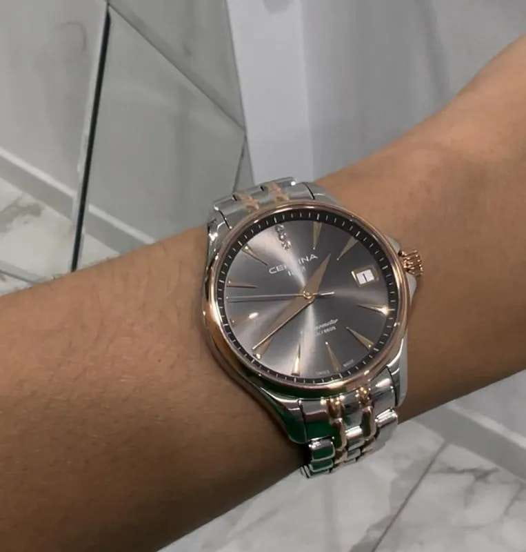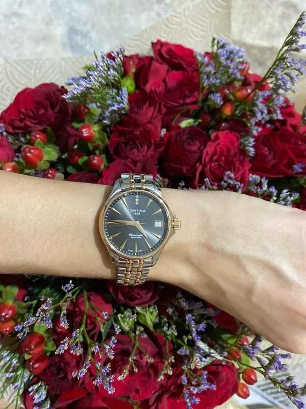 Аксессуар обладает изящным силуэтом, отражающим классический стиль и элегантность. Циферблат украшен 3 роскошными бриллиантами оттенка Top Wesselton. Часы комплектуются высокоточным кварцевым калибром F06.411 от швейцарской компании ETA, высокая точность механизма подтверждается сертификатом хронометра COSCСертификат COSCОфициальный сертификат, подтверждающий то, что часы ходят с особо высокой точностью. Для получения документа часы подвергаются тестовым испытаниям, разработанным швейцарским институтом тестирования хронометров COSC. Допустимая норма для механических часов -4/+6 секунд в день, для кварцевых моделей +/- 0,07 секунд в день.. Концепция DS ConceptDS ConceptDouble Security Concept, обозначает двойную надёжность и безупречную точность часов Certina. Двойная система защиты подразумевает обеспечение максимальной устойчивости к ударам и высоких показателей водонепроницаемости. гарантирует повышенную ударопрочность часов и сохранение водонепроницаемости до 20 бар. Одностороннее антибликовое покрытие сапфирового стекла.Корпус и браслет из хирургической стали 316L. PVD-покрытиеPVDУльтратонкое покрытие наносится в технике вакуумного напыления, сочетает в себе нитрид титана особой прочности со слоем золота или оксида хрома. Несёт в себе декоративную или защитную функцию. цвета розового золота. . Окошко даты, функция EOLEOLПредставляет собой систему, уведомляющую владельца часов о необходимости замены элемента питания. За 2 недели до полного разряда батарейки секундная стрелка перестаёт ходить чётко и начинает перепрыгивать на 3-4 деления.. Диаметр корпуса: 33,8 мм.