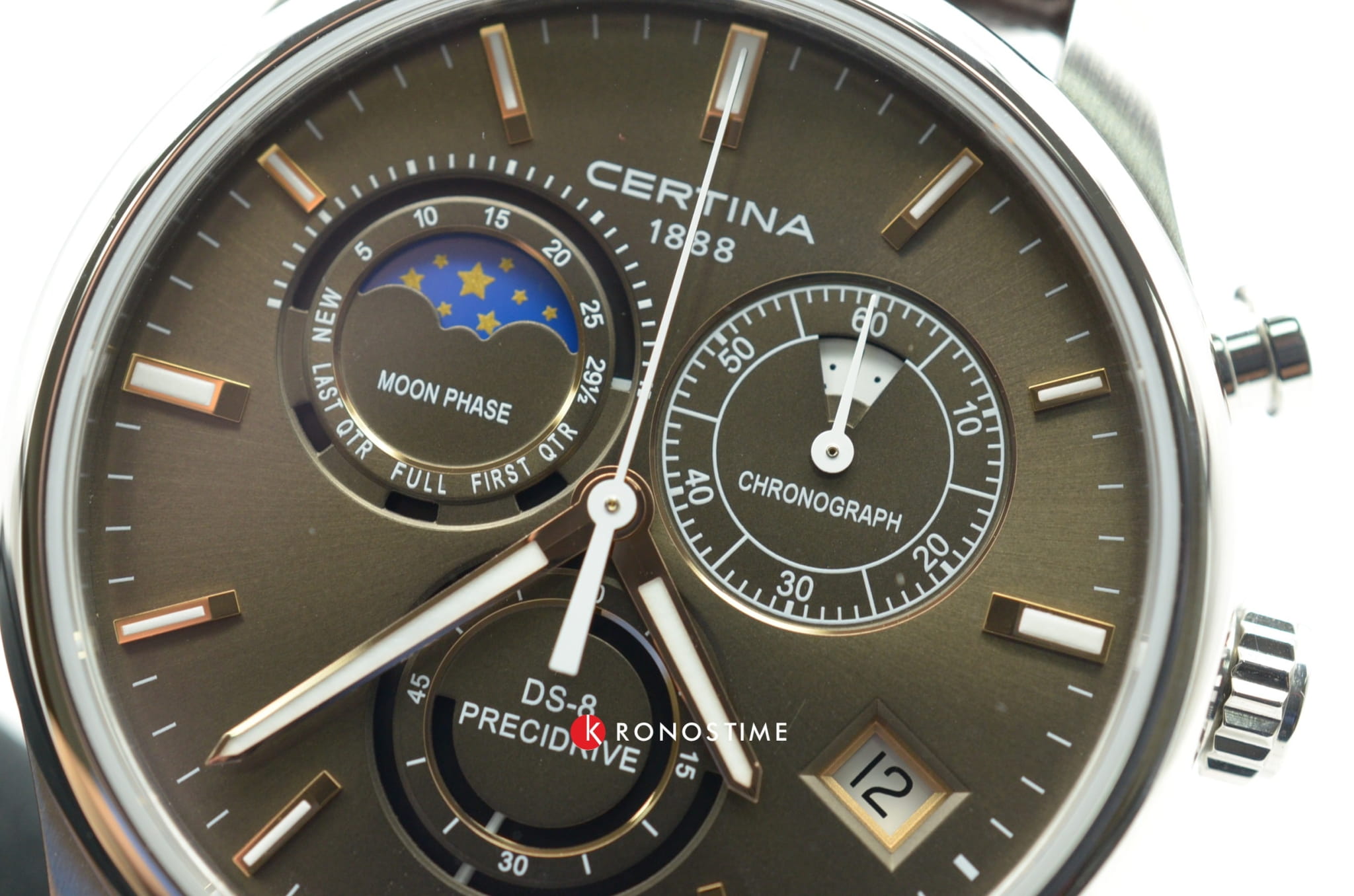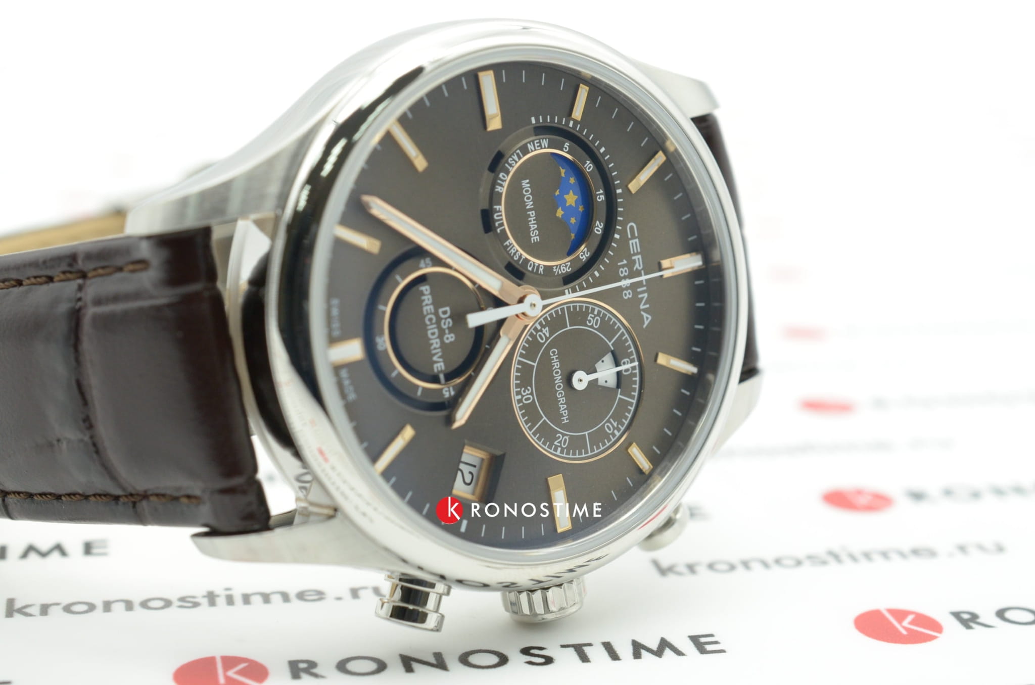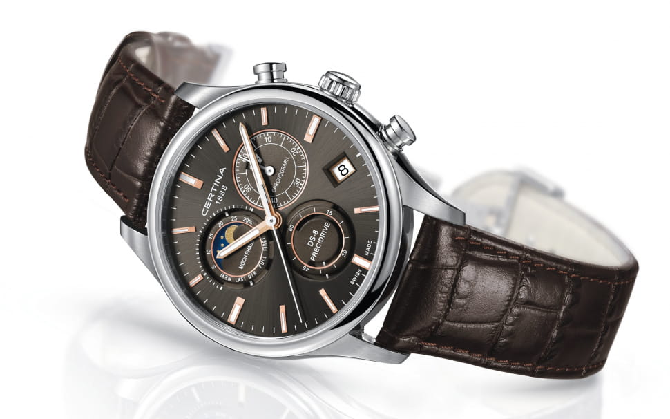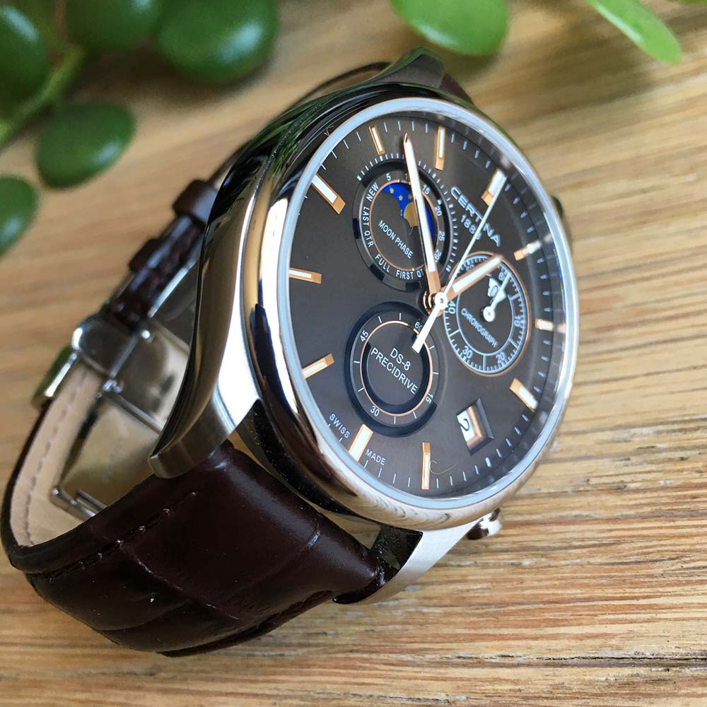 Модель, благодаря классической цветовой гамме и отсутствию броских деталей, станет универсальным аксессуаром к вашему образу. Брендовый хронографХронографФункция позволяет измерять отрезки времени с особой точностью: часы, минуты, секунды. Верным признаком хронографа является наличие на циферблате 3 дополнительных окошек-счётчиков. измеряет время с высокой точностью, что обеспечивает швейцарский кварцевый калибр ETA G10.962 Precidrive™Precidrive™Инновационный кварцевый механизм Certina. Часы, оснащённые этим швейцарским калибром, приравниваются к точности к сертифицированным хронометрам, точность хода составляет +/-10 секунд в год.. Коричневый ремешок из натуральной кожи. Сапфировое стекло с двухсторонним антибликовым покрытием. Корпус из нержавеющей стали 316L. Водостойкость 10 бар. Люминесцентная подсветкаЛюминесцентное покрытиеПозволяет считывать показания времени в темноте. Производители наносят на стрелки, часовые индексы, безель или поверхность циферблата светонакопительный состав, дающий холодное свечение.. Задняя крышка с гравировкой. Секундомер, дата, индикатор EOLEOLПредставляет собой систему, уведомляющую владельца часов о необходимости замены элемента питания. За 2 недели до полного разряда батарейки секундная стрелка перестаёт ходить чётко и начинает перепрыгивать на 3-4 деления., отображение лунных фаз. Диаметр корпуса: 41 мм.