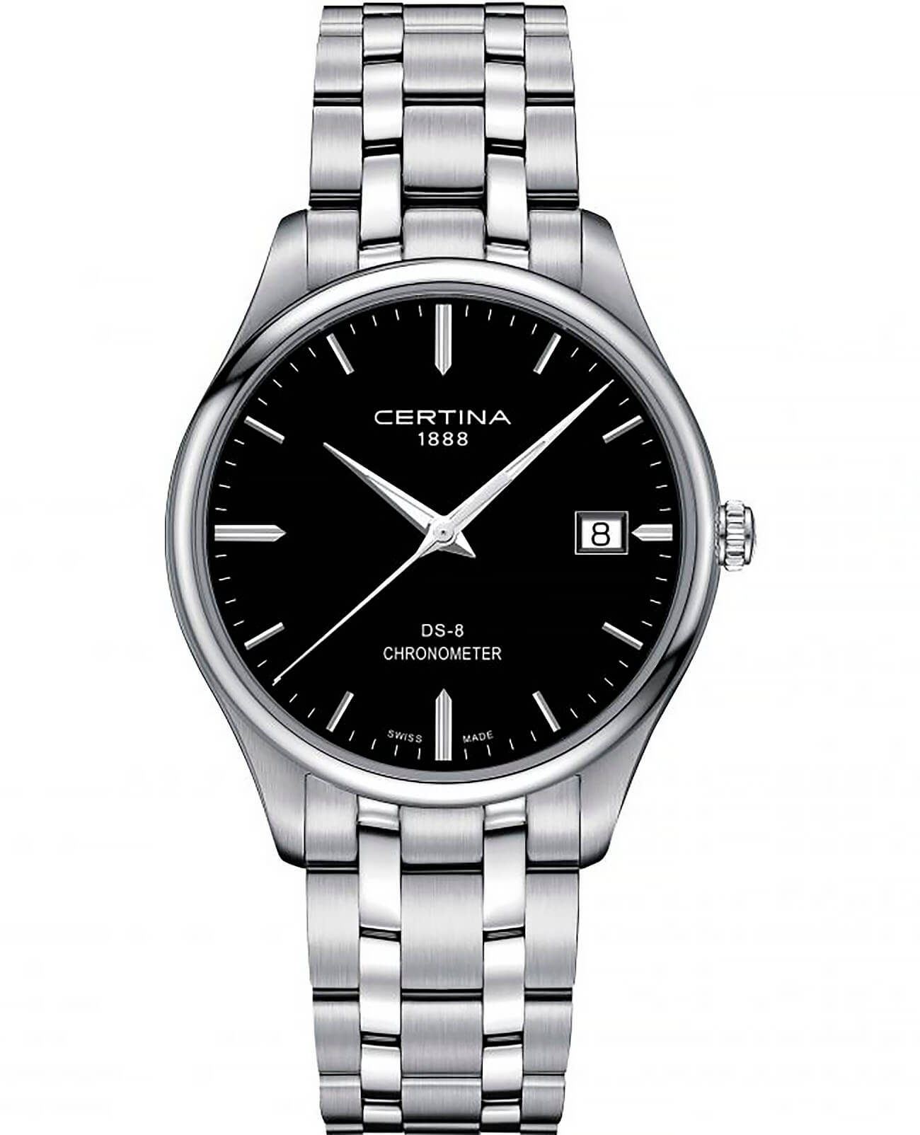 Стильный аксессуар в минималистичном оформлении охарактеризует вас как человека, который действительно разбирается в часах. Модель отличается повышенной точностью хода, это подтверждено официальным сертификатом хронометра COSCСертификат COSCОфициальный сертификат, подтверждающий то, что часы ходят с особо высокой точностью. Для получения документа часы подвергаются тестовым испытаниям, разработанным швейцарским институтом тестирования хронометров COSC. Допустимая норма для механических часов -4/+6 секунд в день, для кварцевых моделей +/- 0,07 секунд в день.. Часы обладают ударопрочным корпусомУдаропрочный корпусМеханизм заключён в корпус, выполненный из современных материалов, устойчивых к ударам, механическим повреждениям и падению с высоты: инновационный пластик, карбон, нержавеющая сталь, титан. и водонепроницаемостью до 10 бар - такие безупречные характеристики появились благодаря фирменной концепции DS ConceptDS ConceptDouble Security Concept, обозначает двойную надёжность и безупречную точность часов Certina. Двойная система защиты подразумевает обеспечение максимальной устойчивости к ударам и высоких показателей водонепроницаемости.. Швейцарский кварцевый механизм ETA F07.412 Precidrive™Precidrive™Инновационный кварцевый механизм Certina. Часы, оснащённые этим швейцарским калибром, приравниваются к точности к сертифицированным хронометрам, точность хода составляет +/-10 секунд в год.. Стекло из сапфира с антибликовым покрытием. Корпус и браслет из нержавеющей стали 316L. Индикация числа, функция EOLEOLПредставляет собой систему, уведомляющую владельца часов о необходимости замены элемента питания. За 2 недели до полного разряда батарейки секундная стрелка перестаёт ходить чётко и начинает перепрыгивать на 3-4 деления.. Диаметр корпуса: 40,2 мм.