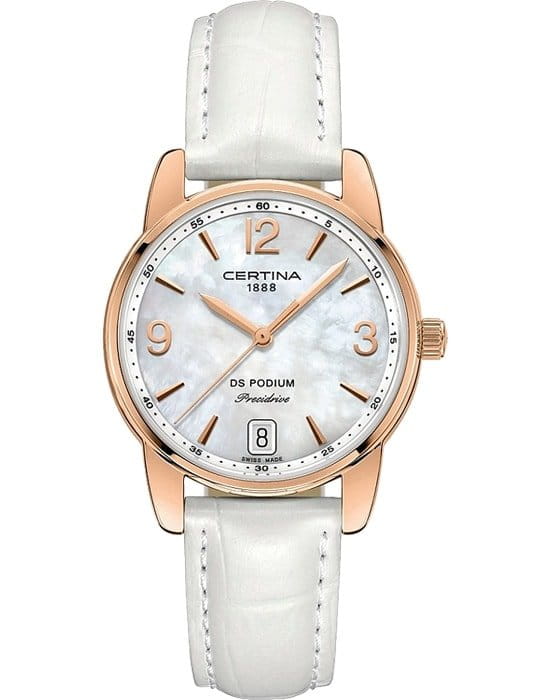 Брендовая модель с утончёнными плавными линиями сделает вас самой модной девушкой на танцевальной вечеринке или рабочей встрече. Прекрасным дополнением к белому перламутровому циферблату стал классический ремешок из натуральной кожи. Инновационный кварцевый швейцарский калибр ETA F06.411 Precidrive™Precidrive™Инновационный кварцевый механизм Certina. Часы, оснащённые этим швейцарским калибром, приравниваются к точности к сертифицированным хронометрам, точность хода составляет +/-10 секунд в год.. Концепция Двойной Надёжности DS ConceptDS ConceptDouble Security Concept, обозначает двойную надёжность и безупречную точность часов Certina. Двойная система защиты подразумевает обеспечение максимальной устойчивости к ударам и высоких показателей водонепроницаемости.. Стекло из сапфира с антибликовым покрытием. Водостойкость 10 бар. Стальной корпус с PVD-покрытиемPVDУльтратонкое покрытие наносится в технике вакуумного напыления, сочетает в себе нитрид титана особой прочности со слоем золота или оксида хрома. Несёт в себе декоративную или защитную функцию. оттенка розового золота. . Индикация текущей даты, функция EOLEOLПредставляет собой систему, уведомляющую владельца часов о необходимости замены элемента питания. За 2 недели до полного разряда батарейки секундная стрелка перестаёт ходить чётко и начинает перепрыгивать на 3-4 деления.. Диаметр корпуса: 33 мм.