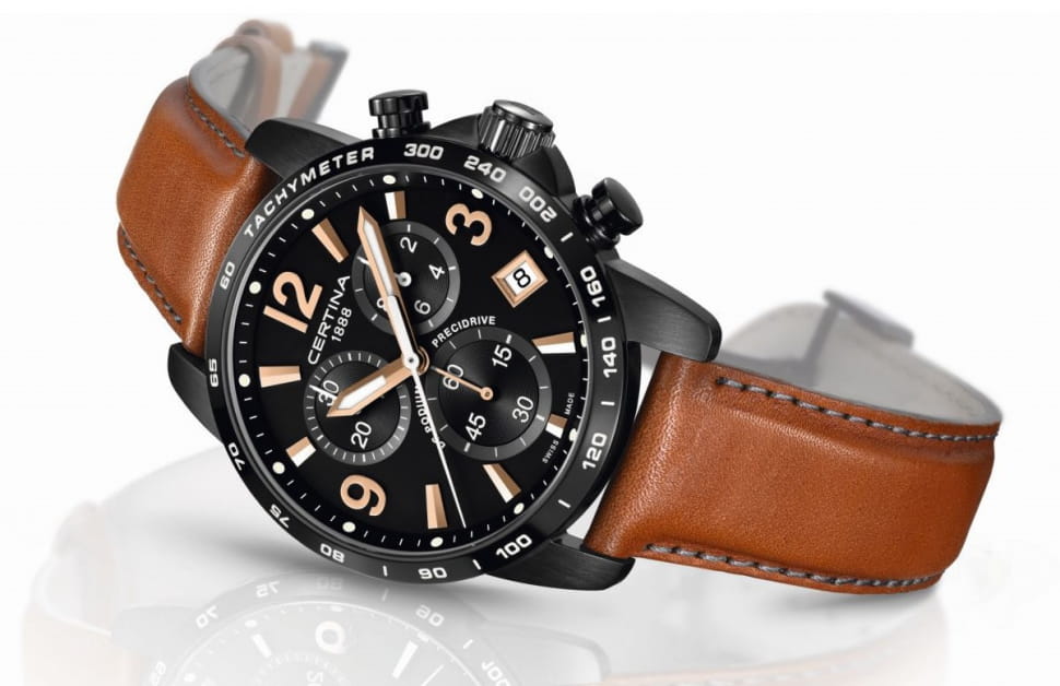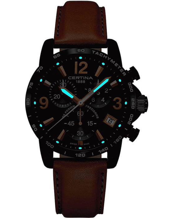 Аксессуар станет неотъемлемым атрибутом образа, наполнит его стильной динамичностью. Швейцарский кварцевый калибр ETA G10.212 Precidrive™Precidrive™Инновационный кварцевый механизм Certina. Часы, оснащённые этим швейцарским калибром, приравниваются к точности к сертифицированным хронометрам, точность хода составляет +/-10 секунд в год. измеряет время с абсолютной точностью, позволяя всегда находиться в центре событий. Концепция Двойной Надёжности DS ConceptDS ConceptDouble Security Concept, обозначает двойную надёжность и безупречную точность часов Certina. Двойная система защиты подразумевает обеспечение максимальной устойчивости к ударам и высоких показателей водонепроницаемости.. Антибликовая поверхность стекла из сапфира. Люминесцентная подсветкаЛюминесцентное покрытиеПозволяет считывать показания времени в темноте. Производители наносят на стрелки, часовые индексы, безель или поверхность циферблата светонакопительный состав, дающий холодное свечение. стрелок. БезельБезельВнешний ободок, закрепляющий стекло. В спортивных часах так называется поворотное кольцо с делениями на циферблате, выполняет роль таймера – замеряет отрезки времени на шкале. Неподвижный безель – элемент декора. Однонаправленно вращающийся безель на дайверских часах позволяет фиксировать моменты погружения и выныривания на поверхность. со шкалой тахиметраТахиметрРазмеченная шкала, располагается на ободке или безеле часов. Тахиметр позволяет рассчитать скорость на определённом участке пути, расстояние измеряется в километрах или милях.. Заводная головка с системой защиты. Ударопрочный корпусУдаропрочный корпусМеханизм заключён в корпус, выполненный из современных материалов, устойчивых к ударам, механическим повреждениям и падению с высоты: инновационный пластик, карбон, нержавеющая сталь, титан. из нержавеющей стали с чёрным PVD-покрытиемPVDУльтратонкое покрытие наносится в технике вакуумного напыления, сочетает в себе нитрид титана особой прочности со слоем золота или оксида хрома. Несёт в себе декоративную или защитную функцию.. Ремешок из натуральной кожи. Безопасная . Окошко даты, секундомер, измеряющий десятые доли секунды, индикатор EOLEOLПредставляет собой систему, уведомляющую владельца часов о необходимости замены элемента питания. За 2 недели до полного разряда батарейки секундная стрелка перестаёт ходить чётко и начинает перепрыгивать на 3-4 деления.. Диаметр корпуса: 41 мм.