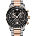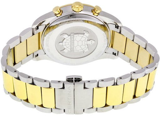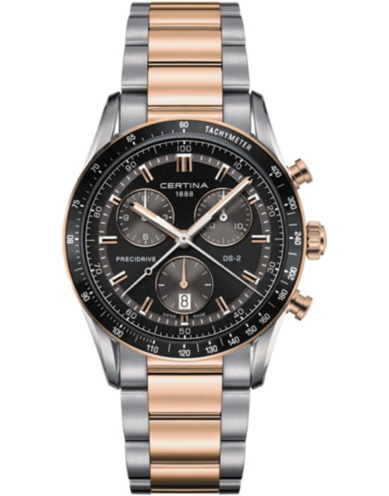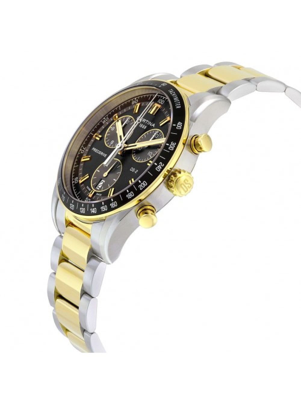 Стальной корпус оснащён алюминиевым безелемБезельВнешний ободок, закрепляющий стекло. В спортивных часах так называется поворотное кольцо с делениями на циферблате, выполняет роль таймера – замеряет отрезки времени на шкале. Неподвижный безель – элемент декора. Однонаправленно вращающийся безель на дайверских часах позволяет фиксировать моменты погружения и выныривания на поверхность., дополненным шкалой тахиметраТахиметрРазмеченная шкала, располагается на ободке или безеле часов. Тахиметр позволяет рассчитать скорость на определённом участке пути, расстояние измеряется в километрах или милях.. Швейцарский кварцевый калибр ETA 251.264 Precidrive™Precidrive™Инновационный кварцевый механизм Certina. Часы, оснащённые этим швейцарским калибром, приравниваются к точности к сертифицированным хронометрам, точность хода составляет +/-10 секунд в год., способствует работе секундомера, измеряющего время с точностью до 1/100 секунды. Функции: хронографХронографФункция позволяет измерять отрезки времени с особой точностью: часы, минуты, секунды. Верным признаком хронографа является наличие на циферблате 3 дополнительных окошек-счётчиков., дата, EOLEOLПредставляет собой систему, уведомляющую владельца часов о необходимости замены элемента питания. За 2 недели до полного разряда батарейки секундная стрелка перестаёт ходить чётко и начинает перепрыгивать на 3-4 деления..