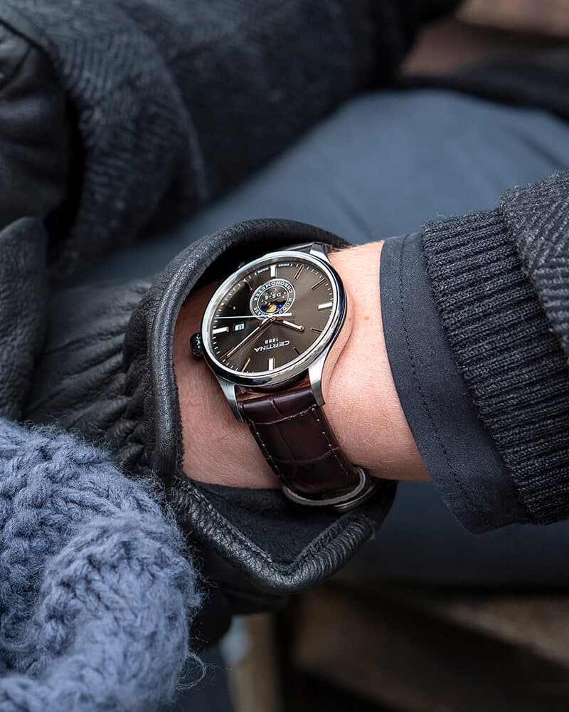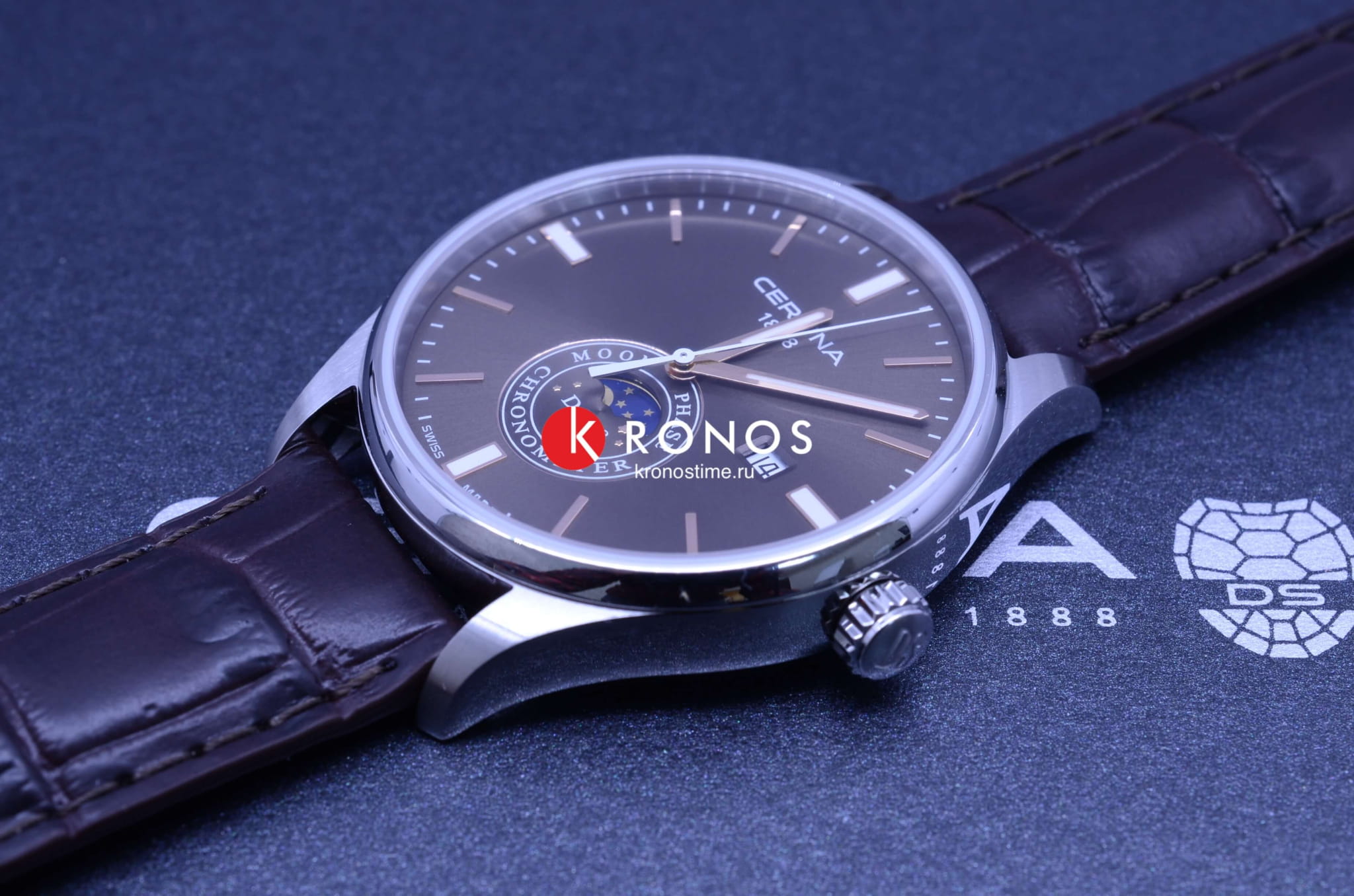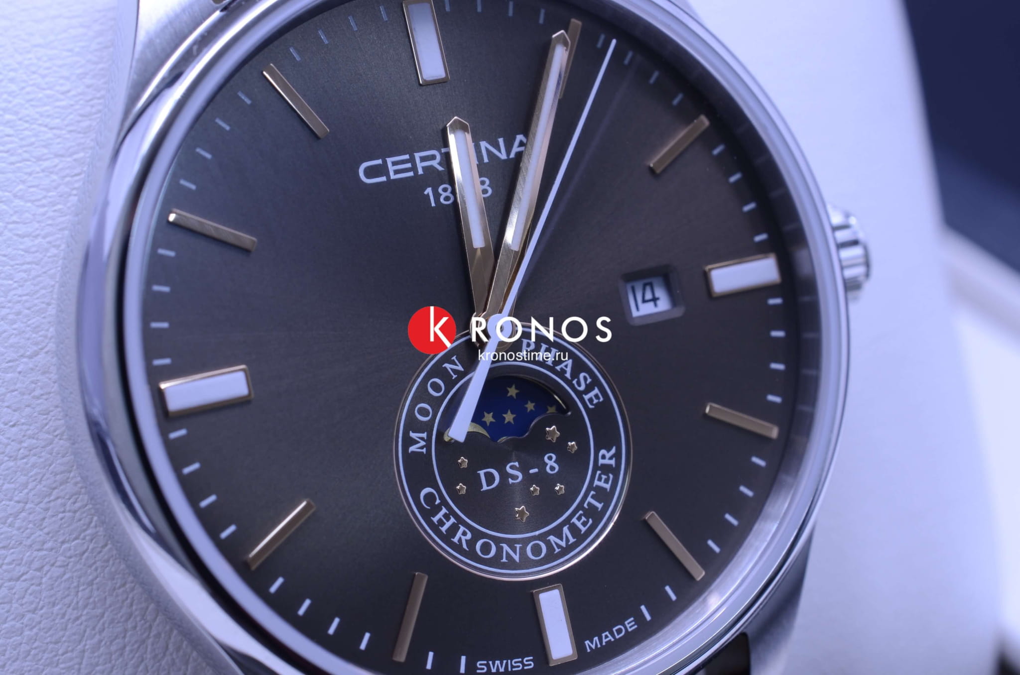 Стильная модель в классическом исполнении оснащена необычным часовым усложнением, окошко в нижней части циферблата отображает лунные фазы. Аксессуар безупречен не только с точки зрения дизайна, он демонстрирует выдающуюся точность хода швейцарского кварцевого механизма ETA F05.841. Такая особенность отмечена официальным сертификатом хронометра COSCСертификат COSCОфициальный сертификат, подтверждающий то, что часы ходят с особо высокой точностью. Для получения документа часы подвергаются тестовым испытаниям, разработанным швейцарским институтом тестирования хронометров COSC. Допустимая норма для механических часов -4/+6 секунд в день, для кварцевых моделей +/- 0,07 секунд в день.. Сапфировое стекло с односторонним антибликовым покрытием. Соблюдение концепции DS ConceptDS ConceptDouble Security Concept, обозначает двойную надёжность и безупречную точность часов Certina. Двойная система защиты подразумевает обеспечение максимальной устойчивости к ударам и высоких показателей водонепроницаемости.. Водостойкость 100 метров. Люминесцентная подсветкаЛюминесцентное покрытиеПозволяет считывать показания времени в темноте. Производители наносят на стрелки, часовые индексы, безель или поверхность циферблата светонакопительный состав, дающий холодное свечение.. Корпус из стали 316L с противокоррозионными свойствами. Ремешок из натуральной кожи. . Функция EOLEOLПредставляет собой систему, уведомляющую владельца часов о необходимости замены элемента питания. За 2 недели до полного разряда батарейки секундная стрелка перестаёт ходить чётко и начинает перепрыгивать на 3-4 деления., отображение текущего числа. Диаметр корпуса: 41 мм.