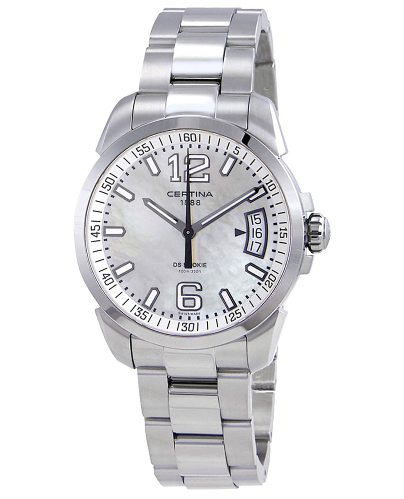Крупные контрастные элементы, расположенные на чёрном циферблате, обеспечивают идеальную читаемость данных вне зависимости от условий видимости. Часы комплектуются швейцарским кварцевым механизмом ETA F07.111, демонстрирующим безупречную точность хода. Система Двойной Надёжности DS ConceptDS ConceptDouble Security Concept, обозначает двойную надёжность и безупречную точность часов Certina. Двойная система защиты подразумевает обеспечение максимальной устойчивости к ударам и высоких показателей водонепроницаемости.. Ударопрочный корпусУдаропрочный корпусМеханизм заключён в корпус, выполненный из современных материалов, устойчивых к ударам, механическим повреждениям и падению с высоты: инновационный пластик, карбон, нержавеющая сталь, титан. и браслет из хирургической стали 316L, устойчивой к коррозии. Люминесцентная подсветкаЛюминесцентное покрытиеПозволяет считывать показания времени в темноте. Производители наносят на стрелки, часовые индексы, безель или поверхность циферблата светонакопительный состав, дающий холодное свечение.. Степень водостойкости WR 100. Функция EOLEOLПредставляет собой систему, уведомляющую владельца часов о необходимости замены элемента питания. За 2 недели до полного разряда батарейки секундная стрелка перестаёт ходить чётко и начинает перепрыгивать на 3-4 деления., оригинальная апертура даты. Диаметр корпуса: 40 мм.