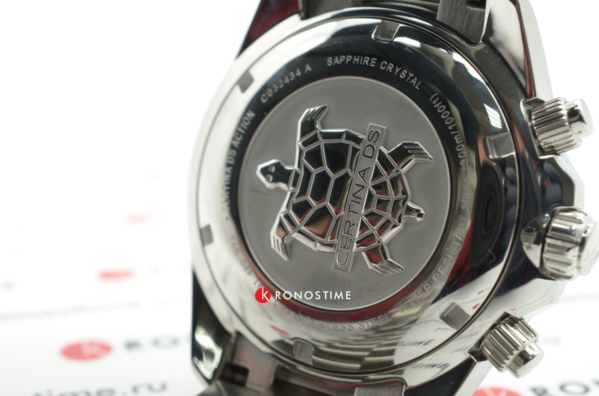 Дайверский хронографХронографФункция позволяет измерять отрезки времени с особой точностью: часы, минуты, секунды. Верным признаком хронографа является наличие на циферблате 3 дополнительных окошек-счётчиков. в чёрно-серебристом исполнении станет идеальным завершением делового, повседневного образа. Аксессуар дополнен безелемБезельВнешний ободок, закрепляющий стекло. В спортивных часах так называется поворотное кольцо с делениями на циферблате, выполняет роль таймера – замеряет отрезки времени на шкале. Неподвижный безель – элемент декора. Однонаправленно вращающийся безель на дайверских часах позволяет фиксировать моменты погружения и выныривания на поверхность. из анодированного алюминия, что облегчает конструкцию часов. Модель сделана из хирургической стали 316L, востребованной благодаря прочности и устойчивости к коррозии. Точность хода швейцарского механизма G10.212 AA PRECIDRIVE приравнивается к хронометрической, что подтверждено сертификатом COSCСертификат COSCОфициальный сертификат, подтверждающий то, что часы ходят с особо высокой точностью. Для получения документа часы подвергаются тестовым испытаниям, разработанным швейцарским институтом тестирования хронометров COSC. Допустимая норма для механических часов -4/+6 секунд в день, для кварцевых моделей +/- 0,07 секунд в день.. Улучшению читаемости показателей в солнечные дни способствует антибликовое покрытие сапфирового стекла. Максимальная водостойкость 300 метров. Концепция DSDS ConceptDouble Security Concept, обозначает двойную надёжность и безупречную точность часов Certina. Двойная система защиты подразумевает обеспечение максимальной устойчивости к ударам и высоких показателей водонепроницаемости.. Люминесцентная подсветкаЛюминесцентное покрытиеПозволяет считывать показания времени в темноте. Производители наносят на стрелки, часовые индексы, безель или поверхность циферблата светонакопительный состав, дающий холодное свечение.. Секундомер, отображение даты. Диаметр корпуса: 43 мм.