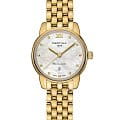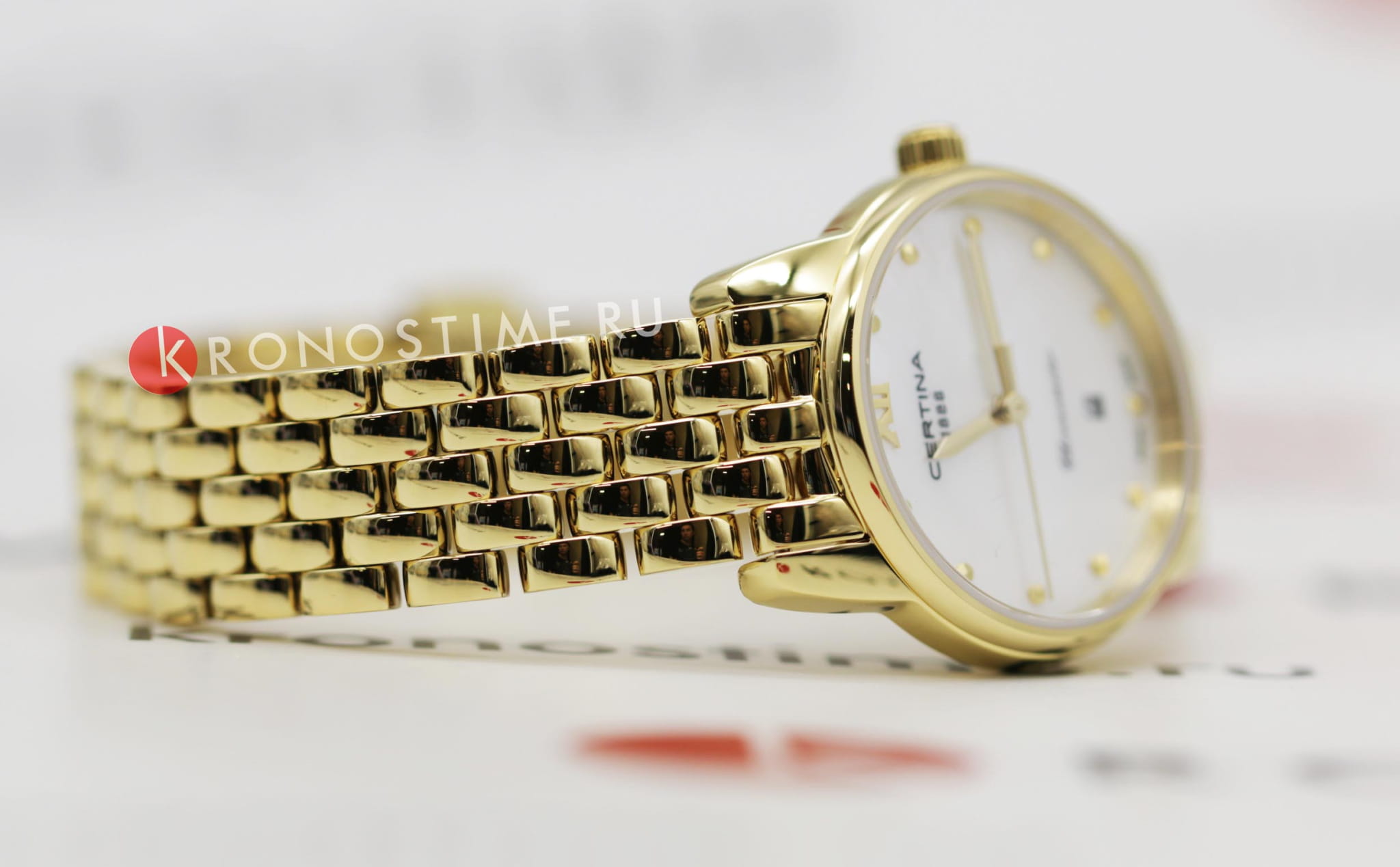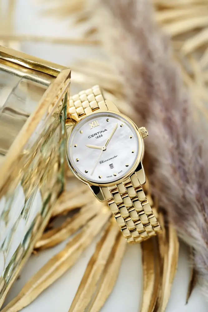 Изысканный аксессуар – лучший вариант для делового костюма или вечернего наряда. Эффектный перламутровый циферблат, бело-серого цвета дополнен незатейливым узором и золотистой часовой разметкой. Часы привлекают не только дизайном, но и абсолютной точностью: швейцарский кварцевый механизм ETA F03.412 Precidrive™Precidrive™Инновационный кварцевый механизм Certina. Часы, оснащённые этим швейцарским калибром, приравниваются к точности к сертифицированным хронометрам, точность хода составляет +/-10 секунд в год. удостоился официального сертификата COSCСертификат COSCОфициальный сертификат, подтверждающий то, что часы ходят с особо высокой точностью. Для получения документа часы подвергаются тестовым испытаниям, разработанным швейцарским институтом тестирования хронометров COSC. Допустимая норма для механических часов -4/+6 секунд в день, для кварцевых моделей +/- 0,07 секунд в день.. Система DS ConceptDS ConceptDouble Security Concept, обозначает двойную надёжность и безупречную точность часов Certina. Двойная система защиты подразумевает обеспечение максимальной устойчивости к ударам и высоких показателей водонепроницаемости.. Противокоррозионная сталь 316L с PVD-покрытиемPVDУльтратонкое покрытие наносится в технике вакуумного напыления, сочетает в себе нитрид титана особой прочности со слоем золота или оксида хрома. Несёт в себе декоративную или защитную функцию.. Степень водозащиты WR 100 позволит плавать, нырять и заниматься другими водными видами спорта. Сапфировое стеклоСапфировое стеклоПрочный и надёжный материал из кристалла сапфира синтетического происхождения, характеризующийся особой твёрдостью и устойчивостью к царапинам и повреждениям. с антибликовой обработкой. Застёжка «бабочка» с кнопкамиЗастёжка "бабочка"Такой вид застёжки дополняется предохранителями, помогающими избежать случайного раскрытия браслета. Обладают изящным исполнением. . Отображение числа, индикатор EOLEOLПредставляет собой систему, уведомляющую владельца часов о необходимости замены элемента питания. За 2 недели до полного разряда батарейки секундная стрелка перестаёт ходить чётко и начинает перепрыгивать на 3-4 деления.. Диаметр корпуса: 27,5 мм.