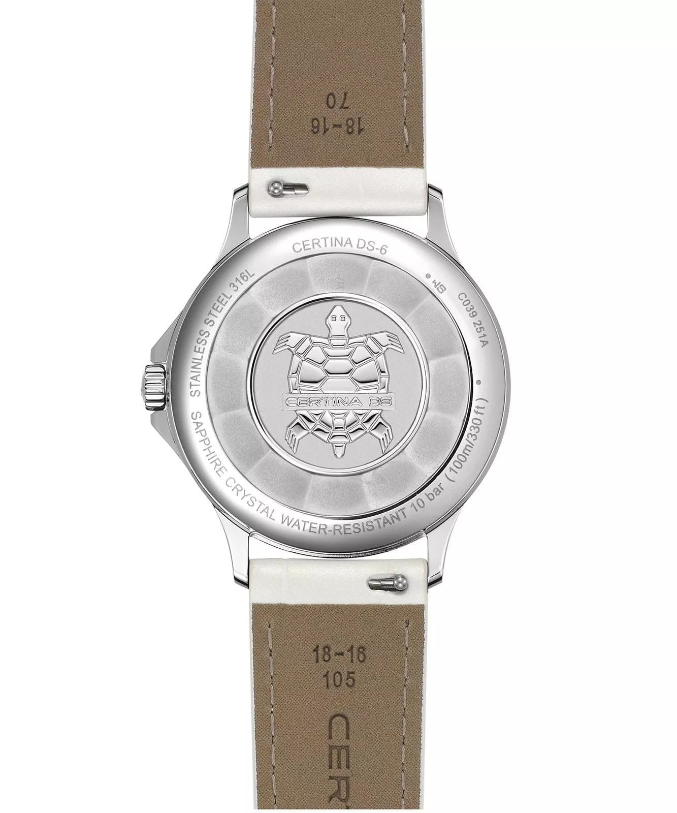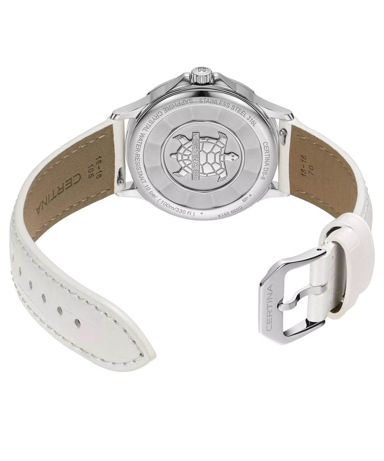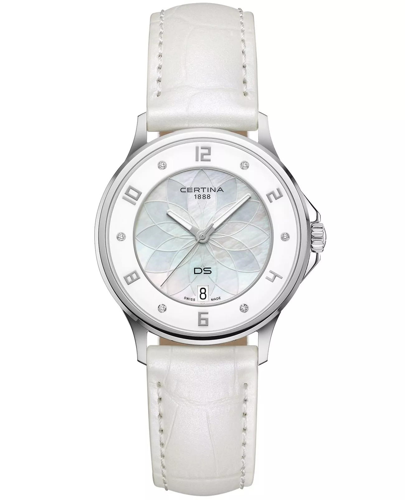Женские швейцарские часы Certina DS-6 Lady C039.251.16.116.00 — это изысканный аксессуар, сочетающий в себе надёжность, точность и элегантный дизайн. Модель выполнена из нержавеющей стали 316L с минеральным стекломМинеральное стеклоМинеральное стекло представляет собой искусственно выращенный минерал кварца. Такое стекло отличается особой устойчивостью к повреждениям и царапинам. Уступает по некоторым качествам сапфировому стеклу. и инкрустированной бриллиантами, что придаёт ей роскошный внешний вид. Циферблат белого перламутра дополнен апертурой даты на отметке 6 часов, а его поверхность защищена сапфировым стекломСапфировое стеклоПрочный и надёжный материал из кристалла сапфира синтетического происхождения, характеризующийся особой твёрдостью и устойчивостью к царапинам и повреждениям. с антибликовым покрытиемАнтибликовое покрытиеСлой оксида металла в 0,13-0,3 микрон, благодаря которому стекло часов не бликует и не отражает свет. Антибликовое покрытие уменьшает отражение света в 10 раз, обеспечивая отличную читаемость показателей циферблата., устойчивым к царапинам и обеспечивающим чёткую видимость при любом освещении. Ремешок из телячьей кожи с тиснением крокодила жемчужно-белого цвета оснащён пряжкой из нержавеющей стали, обеспечивая комфорт и надёжную фиксацию на запястье. Часы водонепроницаемы до 100 метров (, что позволяет использовать их при плавании и других водных активностях без глубокого погружения. Гарантия 24 месяца подтверждает качество и долговечность изделия. Эти часы станут универсальным аксессуаром для тех, кто ценит сочетание стиля, функциональности и швейцарского мастерства — идеальный выбор для повседневной носки и торжественных случаев.