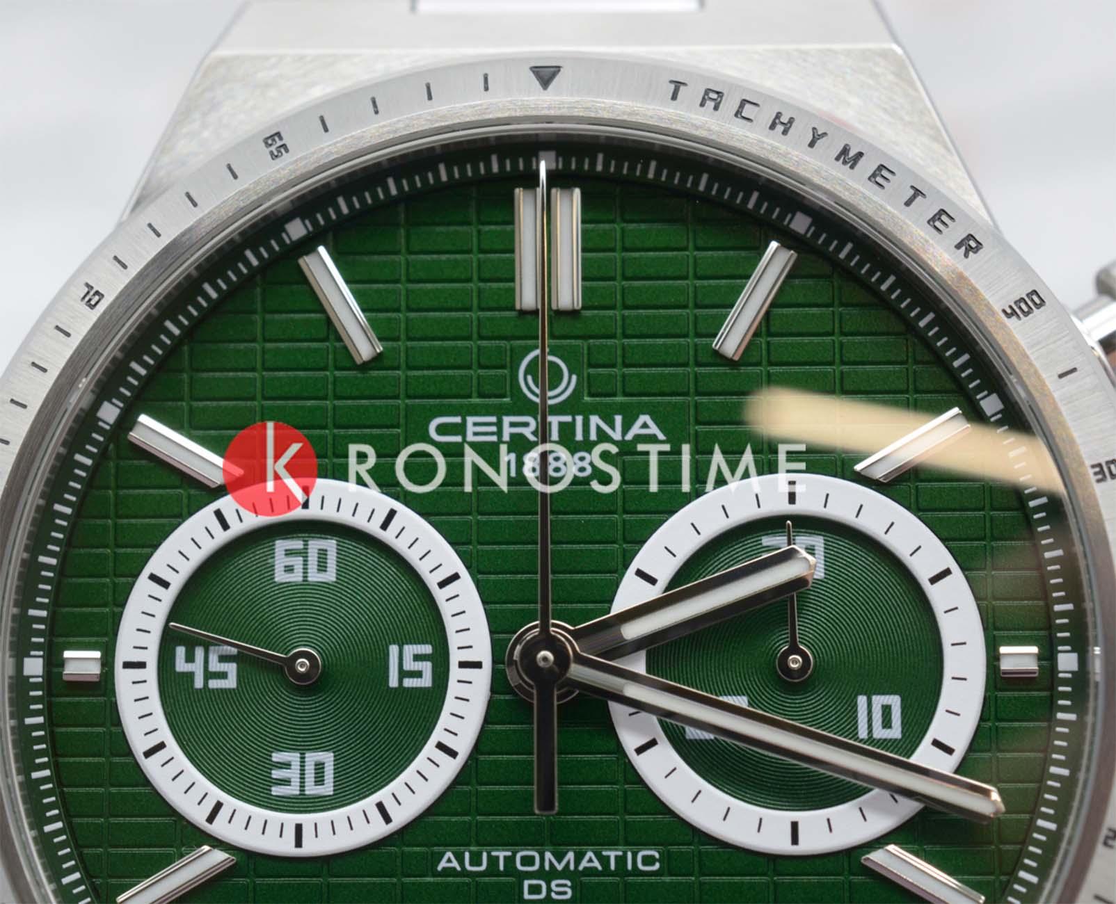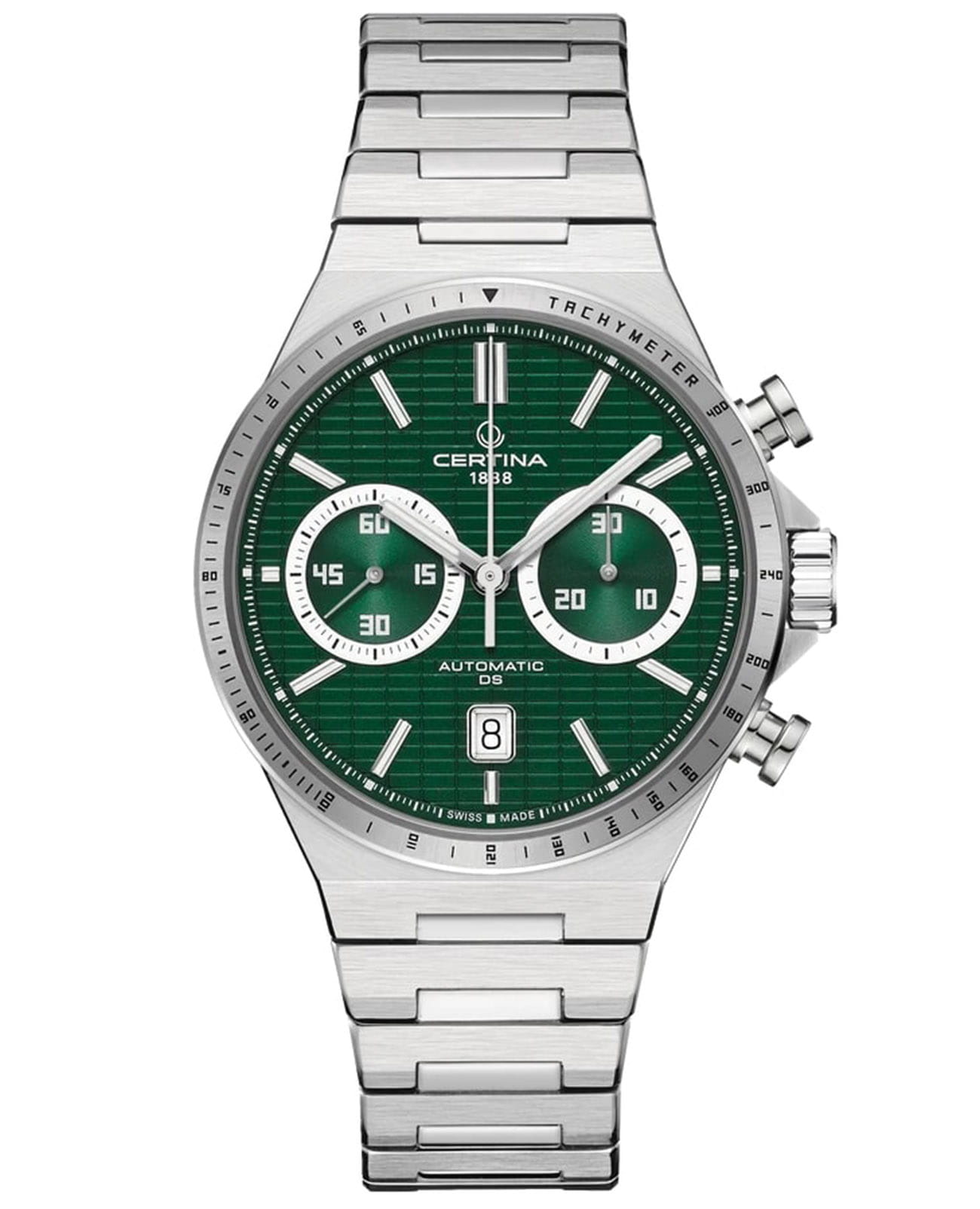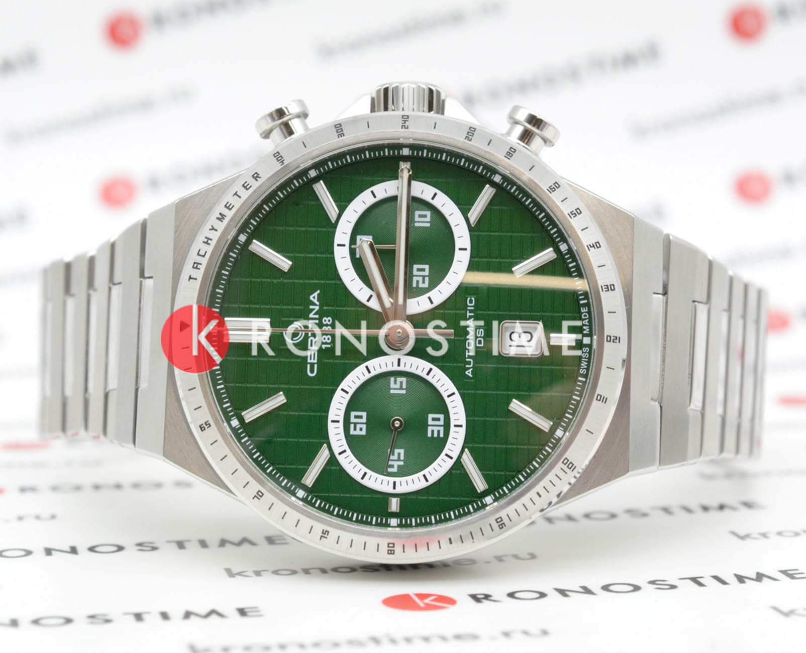 Мужские часы-хронографХронографФункция позволяет измерять отрезки времени с особой точностью: часы, минуты, секунды. Верным признаком хронографа является наличие на циферблате 3 дополнительных окошек-счётчиков. Certina DS-7 Chrono Auto C043.427.11.091.00. Корпус часов изготовлен из нержавеющей стали 316L. Под твердым сапфировым стекломСапфировое стеклоПрочный и надёжный материал из кристалла сапфира синтетического происхождения, характеризующийся особой твёрдостью и устойчивостью к царапинам и повреждениям. с антибликовым покрытиемАнтибликовое покрытиеСлой оксида металла в 0,13-0,3 микрон, благодаря которому стекло часов не бликует и не отражает свет. Антибликовое покрытие уменьшает отражение света в 10 раз, обеспечивая отличную читаемость показателей циферблата. Окошко даты в положении 6 часа, а также маркировку, покрытую люминесцентным покрытиемЛюминесцентное покрытиеПозволяет считывать показания времени в темноте. Производители наносят на стрелки, часовые индексы, безель или поверхность циферблата светонакопительный состав, дающий холодное свечение. Super-LumiNova. Класс водозащиты: 100 метров, позволит плавать, нырять и заниматься другими водными видами спорта. Стальной браслет на застёжке-бабочке с кнопкамиЗастёжка "бабочка"Такой вид застёжки дополняется предохранителями, помогающими избежать случайного раскрытия браслета. Обладают изящным исполнением. .ТахиметрТахиметрРазмеченная шкала, располагается на ободке или безеле часов. Тахиметр позволяет рассчитать скорость на определённом участке пути, расстояние измеряется в километрах или милях..